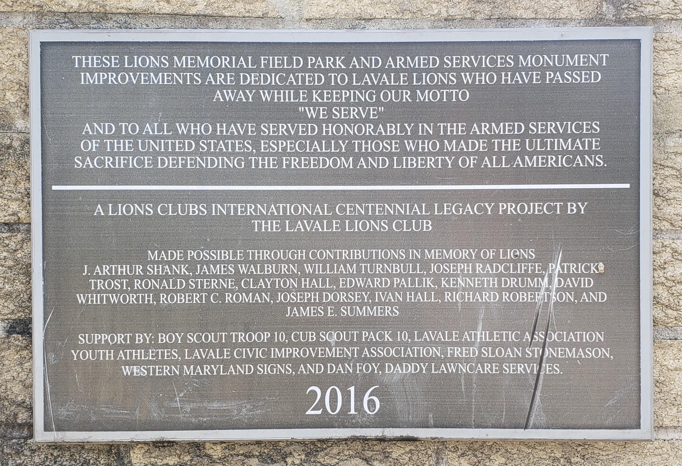 LIONS MEMORIAL FIELD PARK AND ARMED SERVICES MONUMENT PLAQUE A