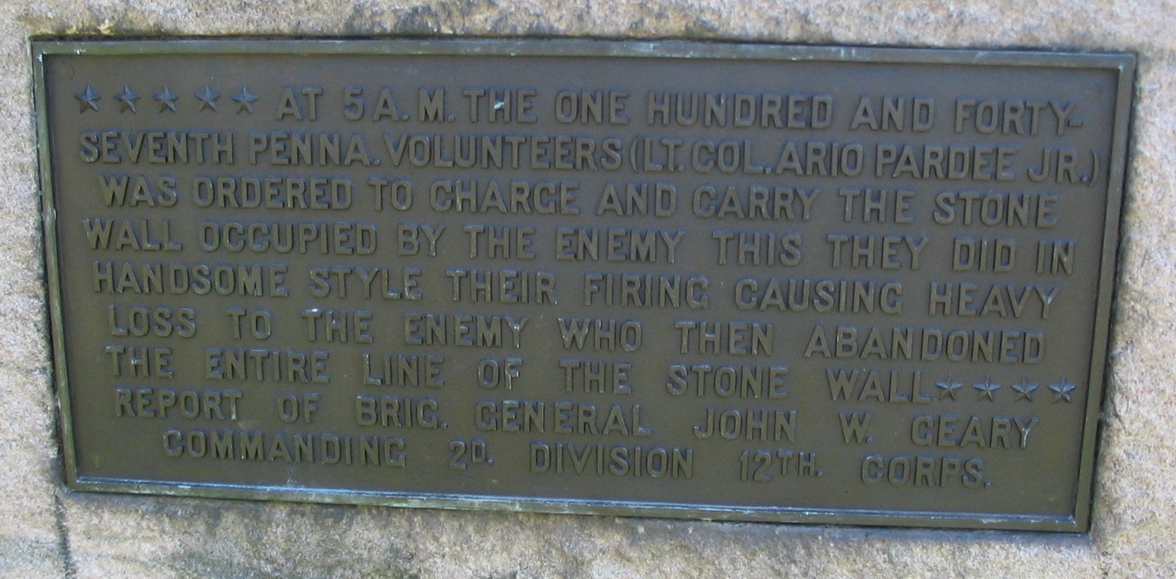 AT 5:AM THE ONE HUNDRED AND FORTY-SEVENTH PENNA. VOLUNTEERS (LT. COL. ARIO PARDEE JR.) WAS ORDERED TO CHARGE AND CARRY THE STONE WALL OCCUPIED BY THE ENEMY THIS THEY DID IN HANDSOME STYLE THEIR FIRING CAUSING HEAVY LOSS TO THE ENEMY WHO THEN ABANDONED THE ENTIRE LINE OF STONEWALL.