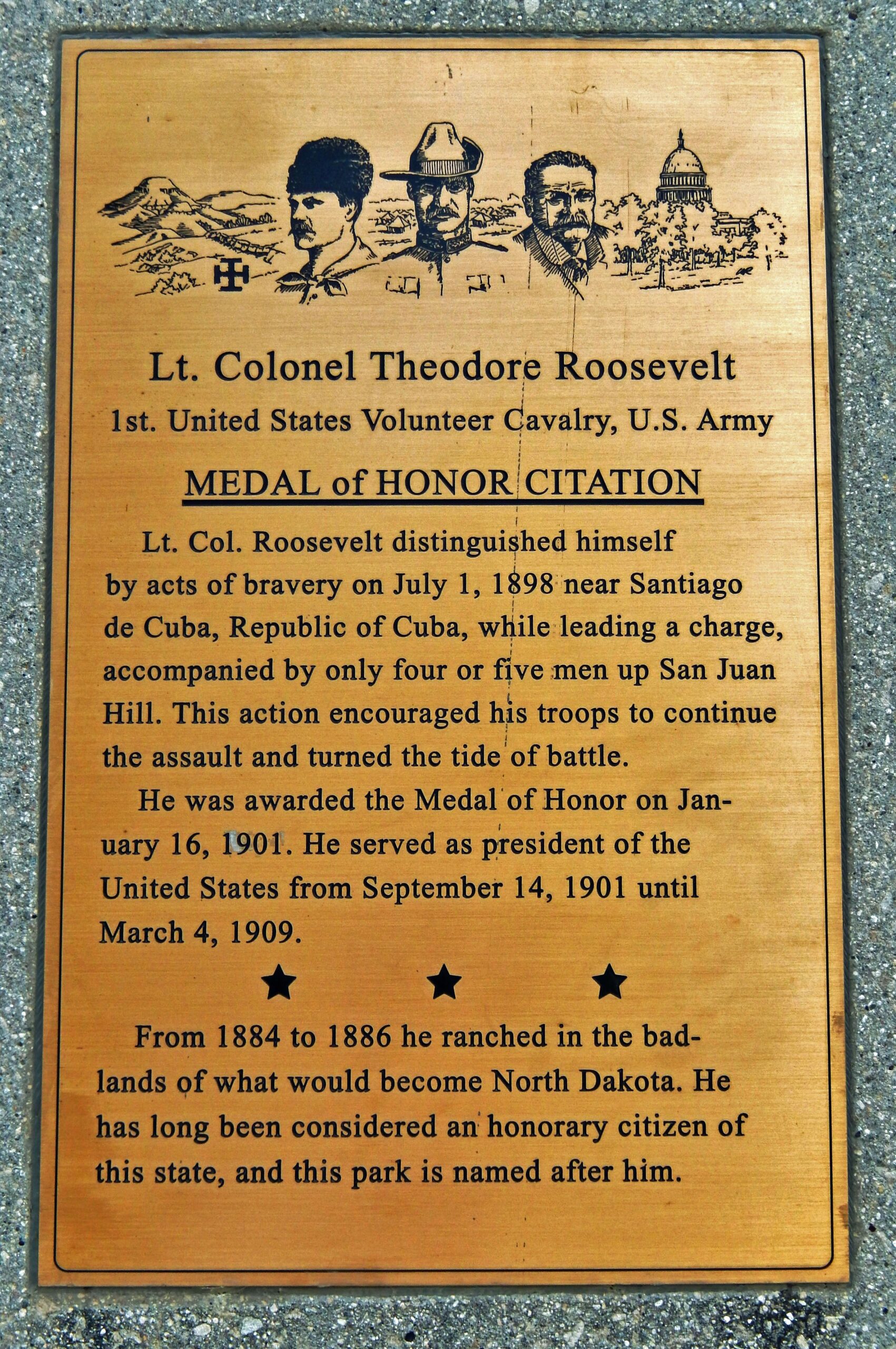 LT. COLONEL THEODORE ROOSEVELT MEDAL OF HONOR CITATION MEMORIAL PLAQUE