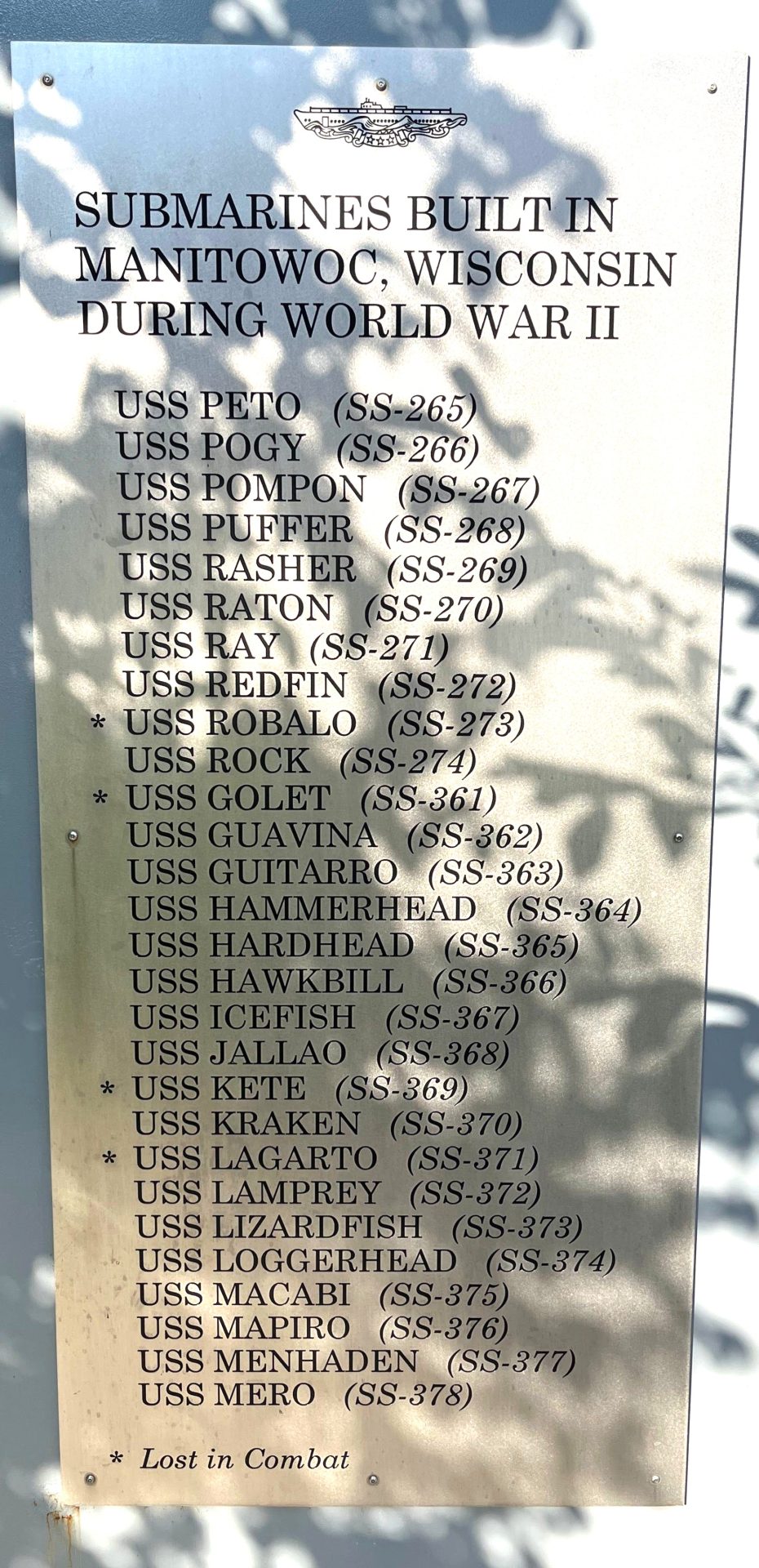 SEE ALSO-MANITOWOC, WISCONSIN WORLD WAR II SUBMARINE VETERANS MEMORIAL PLAQUE FRONT