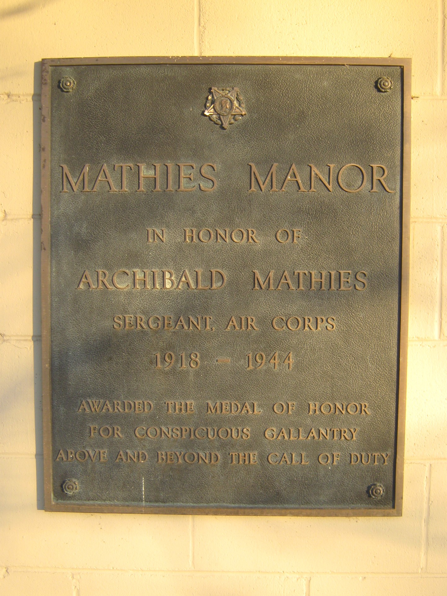 MATHIES MANOR MEDAL OF HONOR WAR MEMORIAL PLAQUE