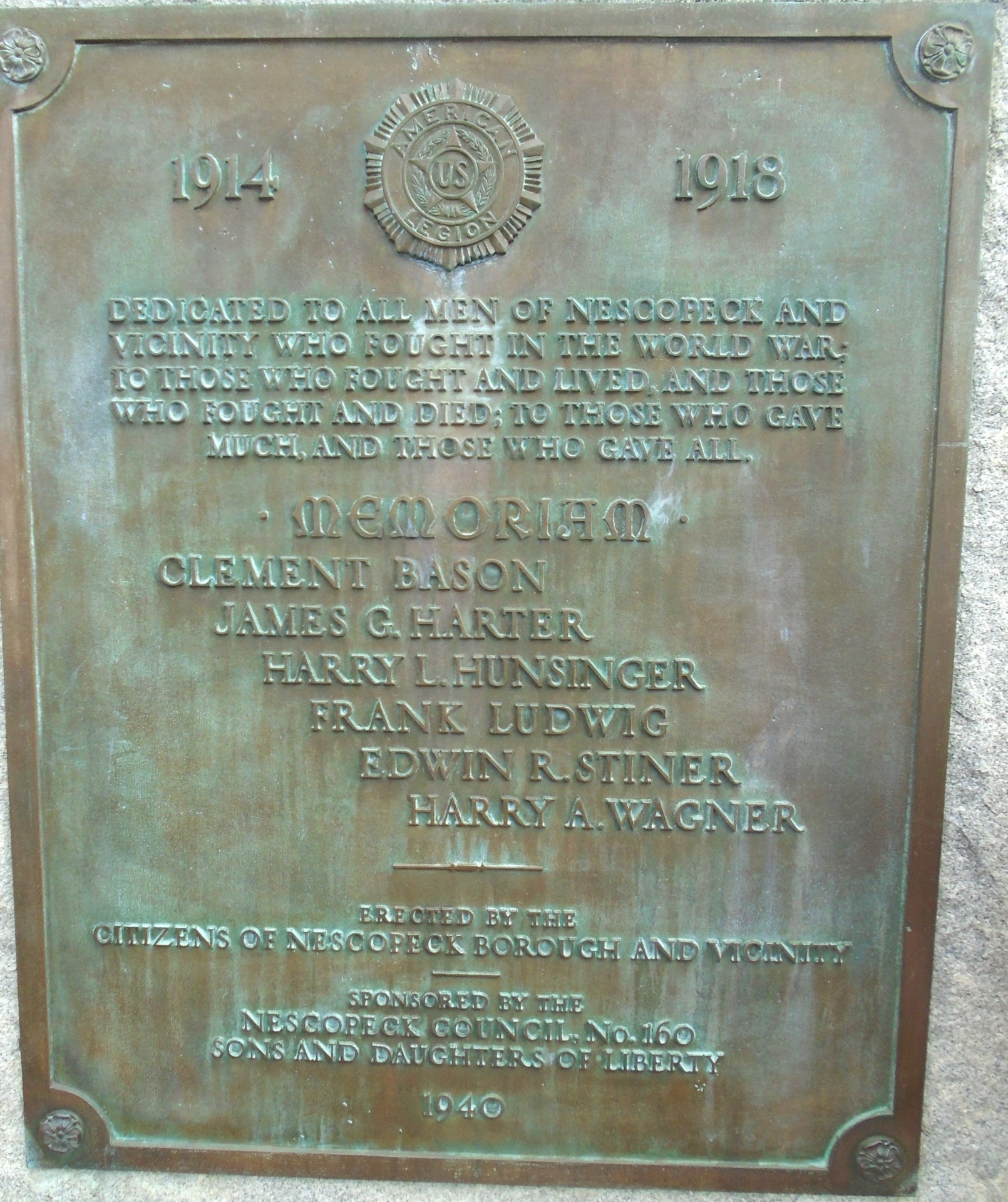 NESCOPECK AND VICINITY WORLD WAR VETERANS MEMORIAL PLAQUE