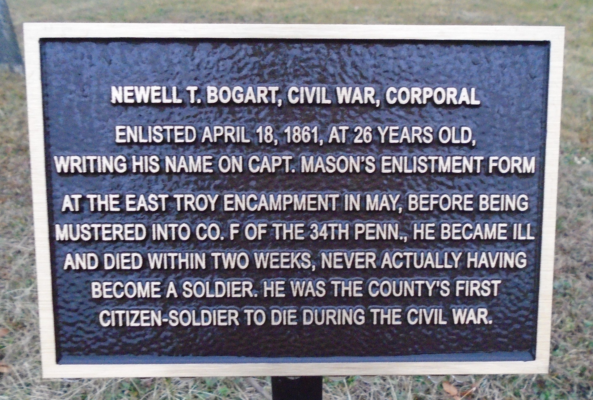 NEWELL T. BOGART, CIVIL WAR, CORPORAL WAR MEMORIAL PLAQUE
