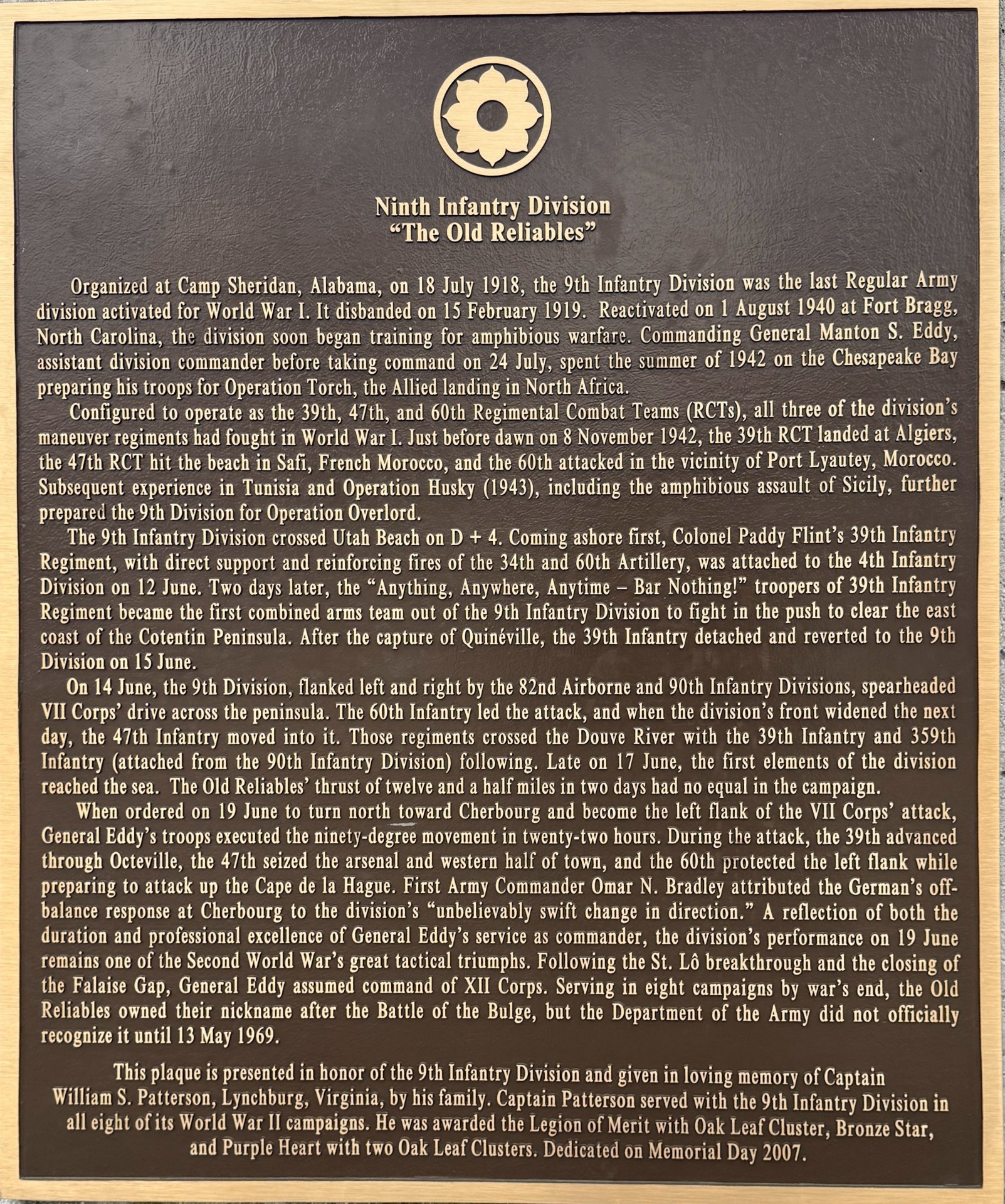 NINTH INFANTRY DIVISION WAR MEMORIAL PLAQUE