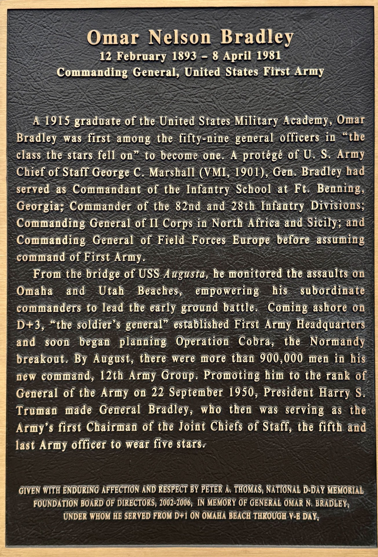 OMAR NELSON BRADLEY WAR MEMORIA PLAQUE
