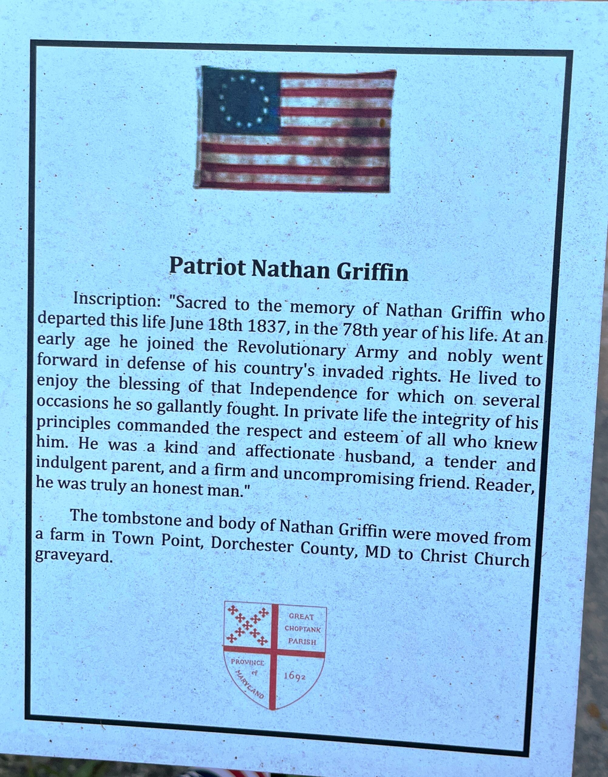 PATRIOT NATHAN GRIFFIN MEMORIAL PLAQUE