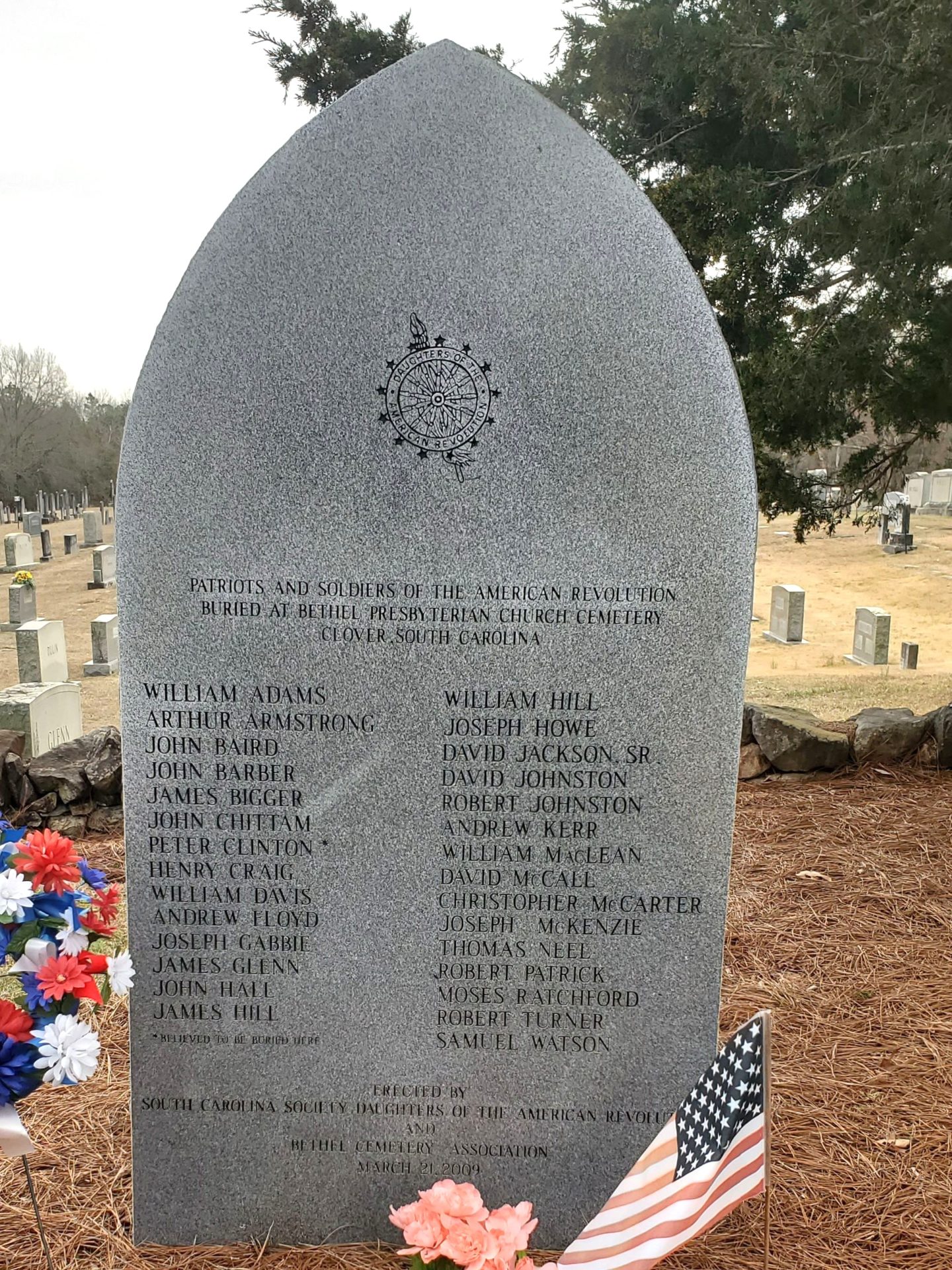 PATRIOTS AND SOLDIERS OF THE AMERICAN REVOLUTION BURIED AT BETHEL PRESBYTERIAN CHURCH CEMETERY MEMORIAL