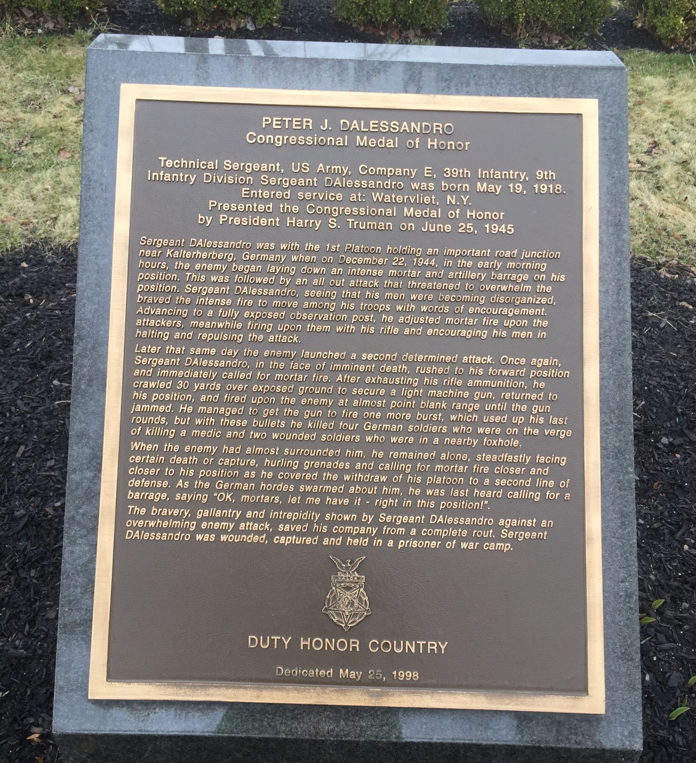 He was with the 1st Platoon holding an important road junction on high ground near Kalterherberg, Germany, on 22 December 1944. In the early morning hours, the enemy after laying down an intense artillery and mortar barrage, followed through with an all-out attack that threatened to overwhelm the position. T/Sgt. Dalessandro, seeing that his men were becoming disorganized, braved the intense fire to move among them with words of encouragement. Advancing to a fully exposed observation post, he adjusted mortar fire upon the attackers, meanwhile firing upon them with his rifle and encouraging his men in halting and repulsing the attack. Later in the day the enemy launched a second determined attack. Once again, T/Sgt. Dalessandro, in the face of imminent death, rushed to his forward position and immediately called for mortar fire. After exhausting his rifle ammunition, he crawled 30 yards over exposed ground to secure a light machinegun, returned to his position, and fired upon the enemy at almost pointblank range until the gun jammed. He managed to get the gun to fire 1 more burst, which used up his last round, but with these bullets he killed 4 German soldiers who were on the verge of murdering an aid man and 2 wounded soldiers in a nearby foxhole. When the enemy had almost surrounded him, he remained alone, steadfastly facing almost certain death or capture, hurling grenades and calling for mortar fire closer and closer to his outpost as he covered the withdrawal of his platoon to a second line of defense. As the German hordes swarmed about him, he was last heard calling for a barrage, saying, “OK, mortars, let me have it–right in this position!” The gallantry and intrepidity shown by T/Sgt. Dalessandro against an overwhelming enemy attack saved his company from complete rout.