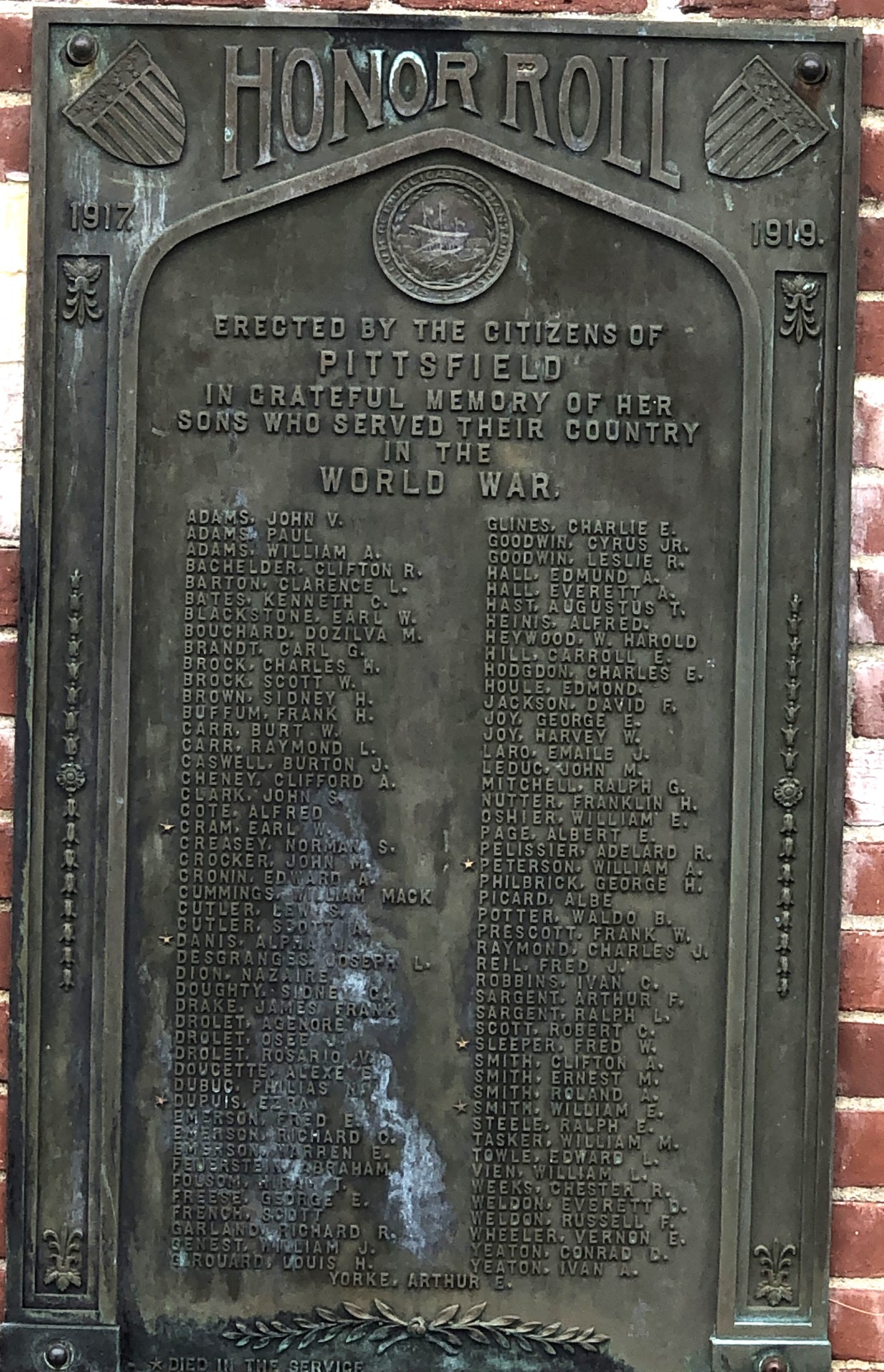 PITTSFIELD NH WORLD WAR HONOR ROLL MEMORIAL PLAQUE