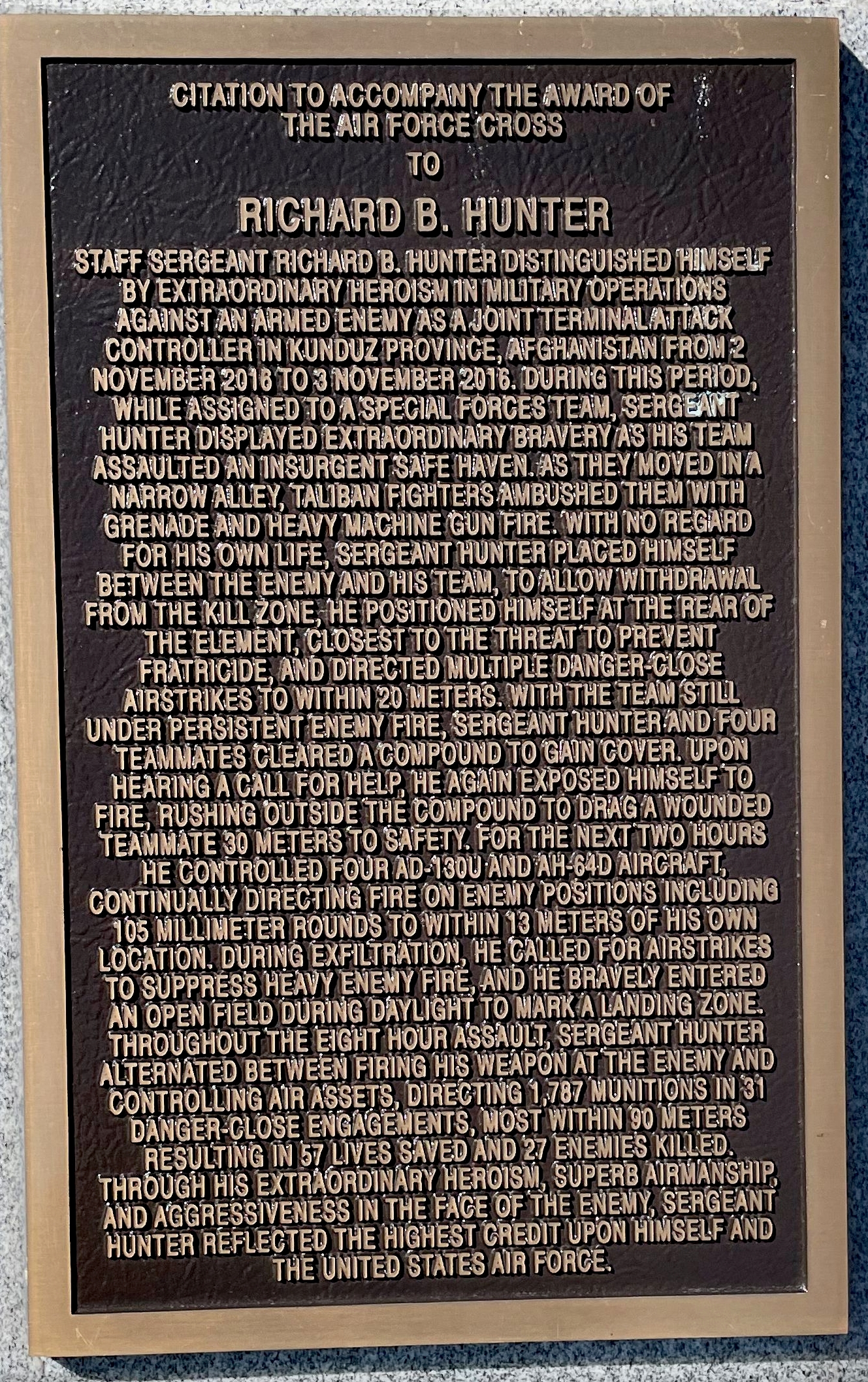 RICHARD B. HUNTER AIR FORCE CROSS CITATION MEMORIAL PLAQUE