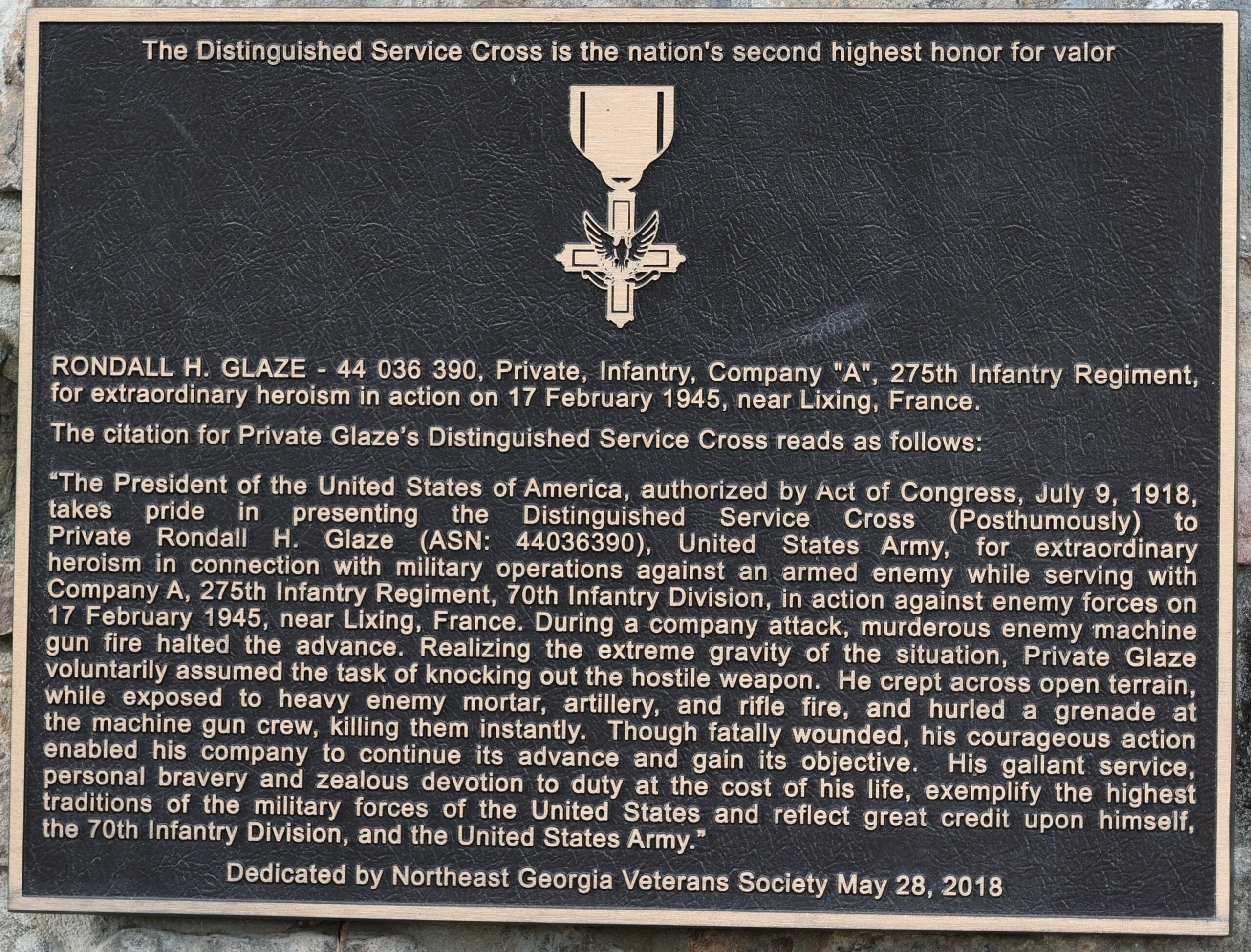 RONALD H. GLAZE DISTINGUISHED SERVICE CROSS WAR MEMORIAL PLAQUE A