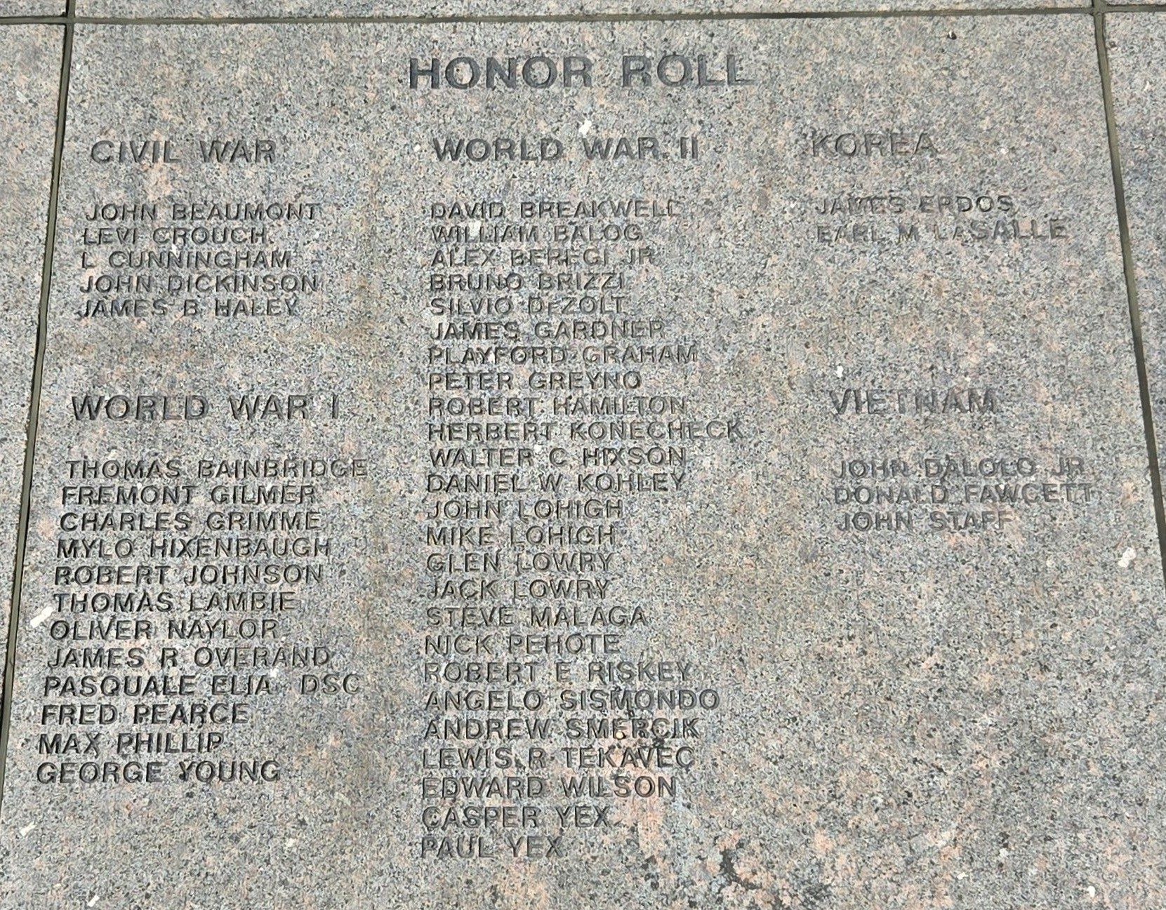 Wars Commemorated: CIVIL WAR, WORLD WAR I, WORLD WAR II, KOREAN WAR AND VIETNAM WAR