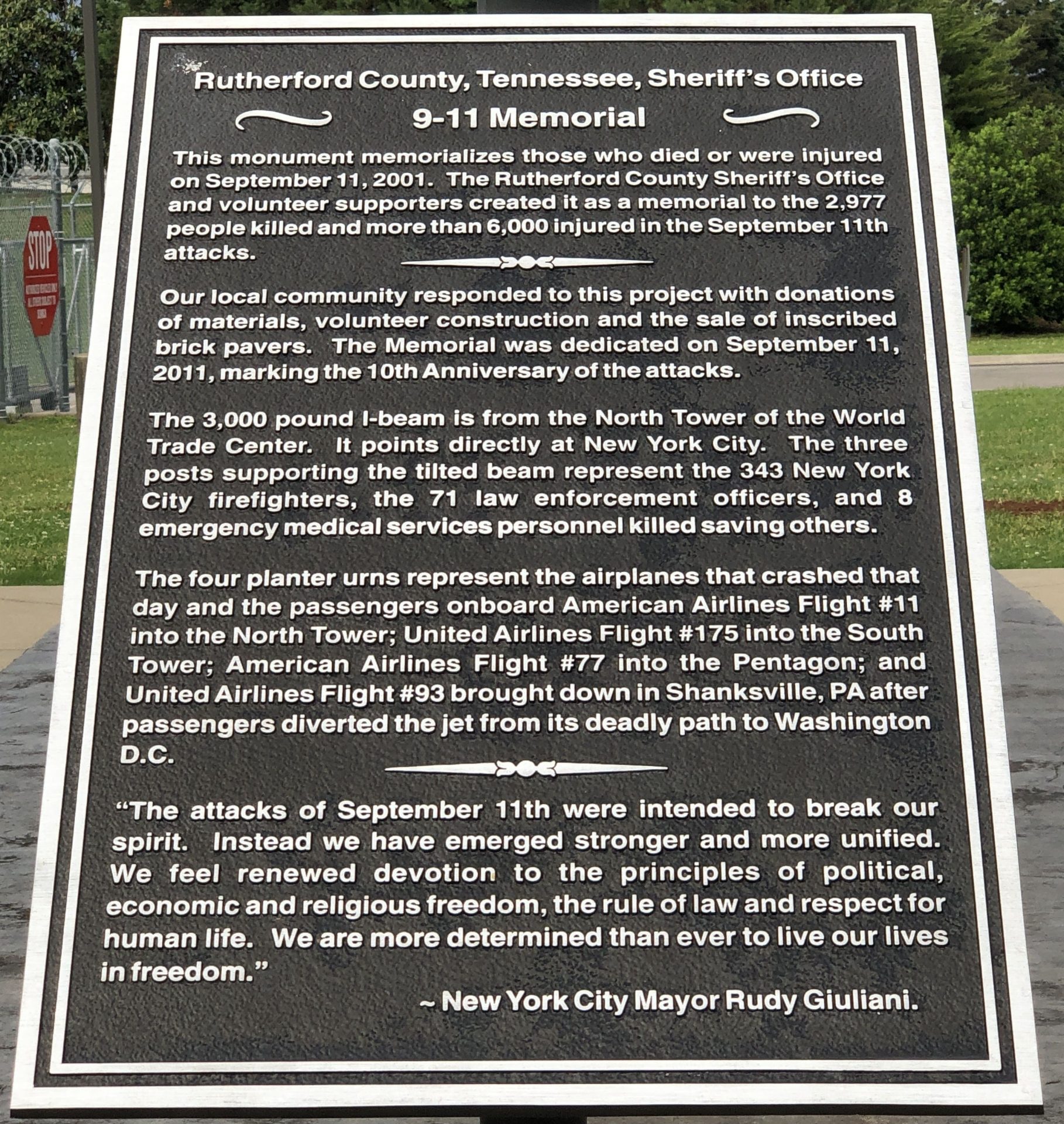 RUTHERFORD COUNTY, TENNESSEE, SHERIFF’S OFFICE 9-11 MEMORIAL PLAQUE