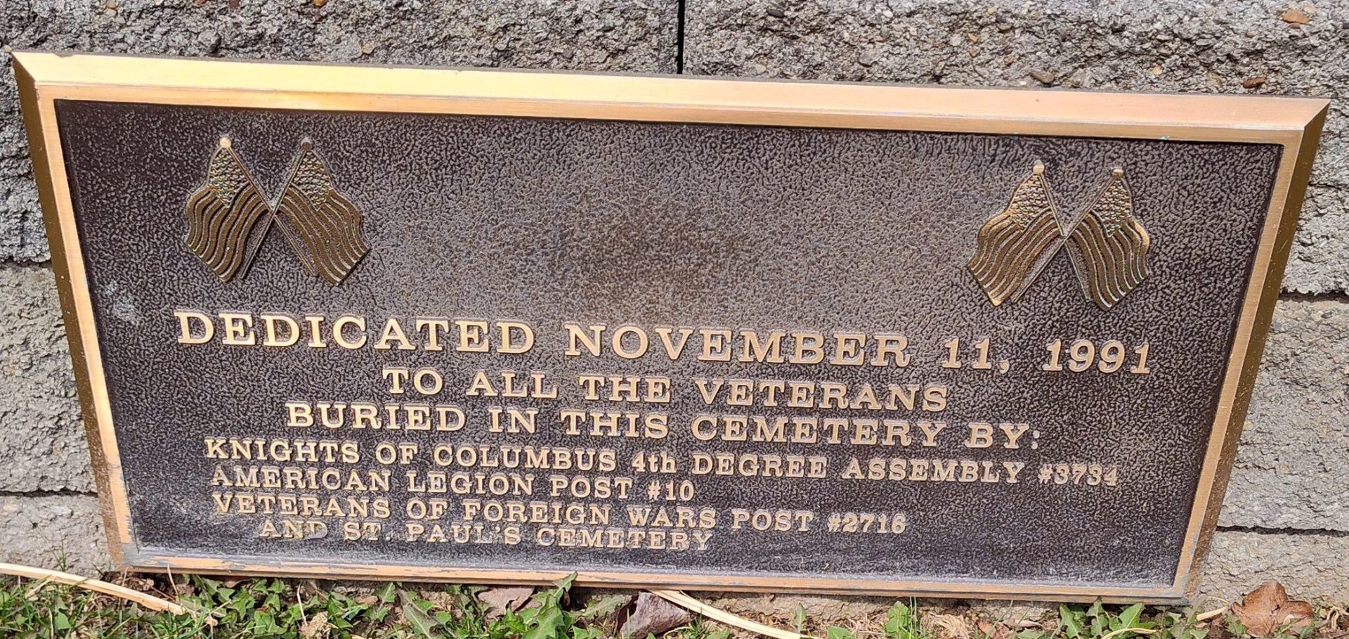 SAINT PAUL CATHOLIC CEMETERY VETERANS MEMORIAL PLAQUE