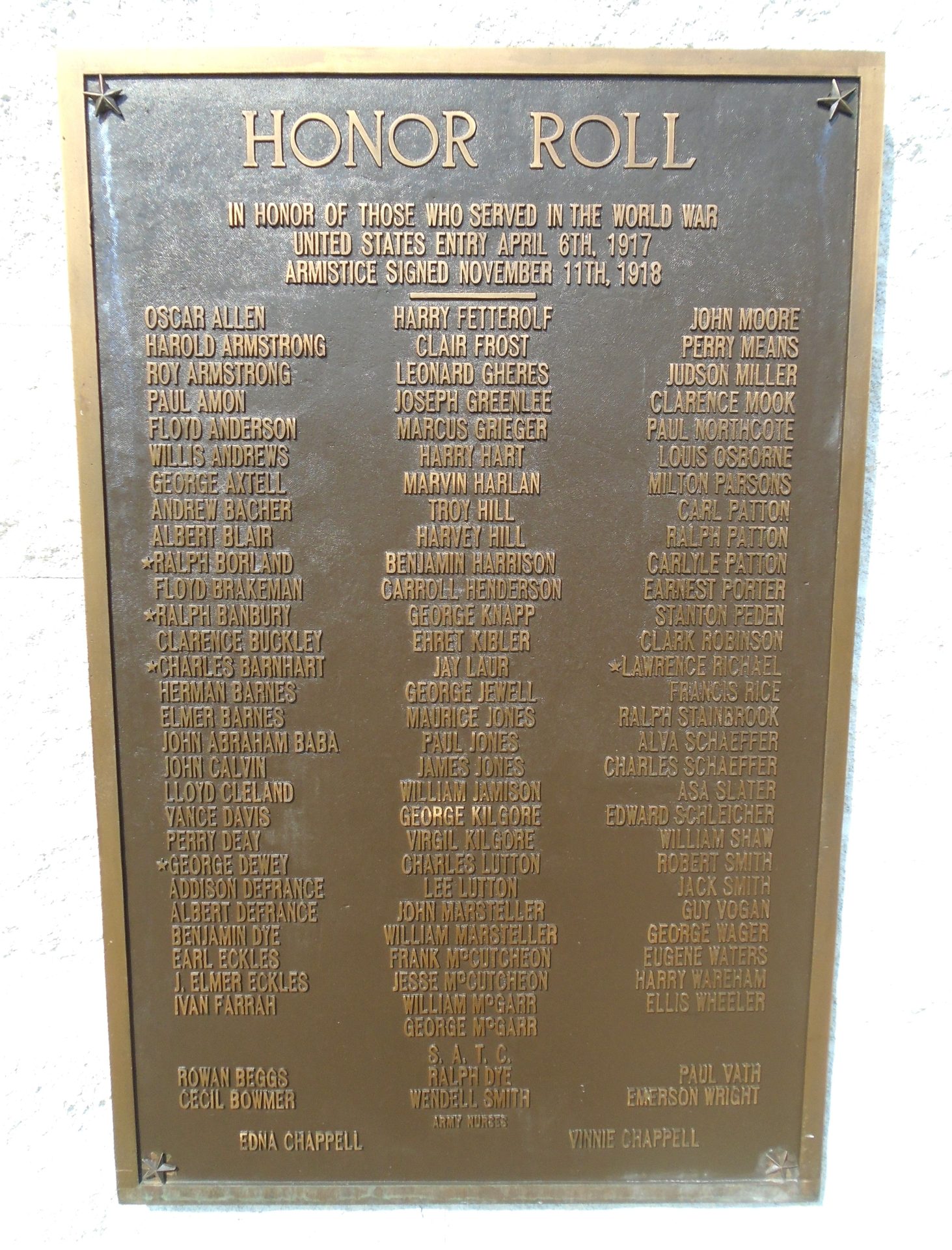 Type of Memorial: War Memorial Honor Roll Plaques, Panels and Stones