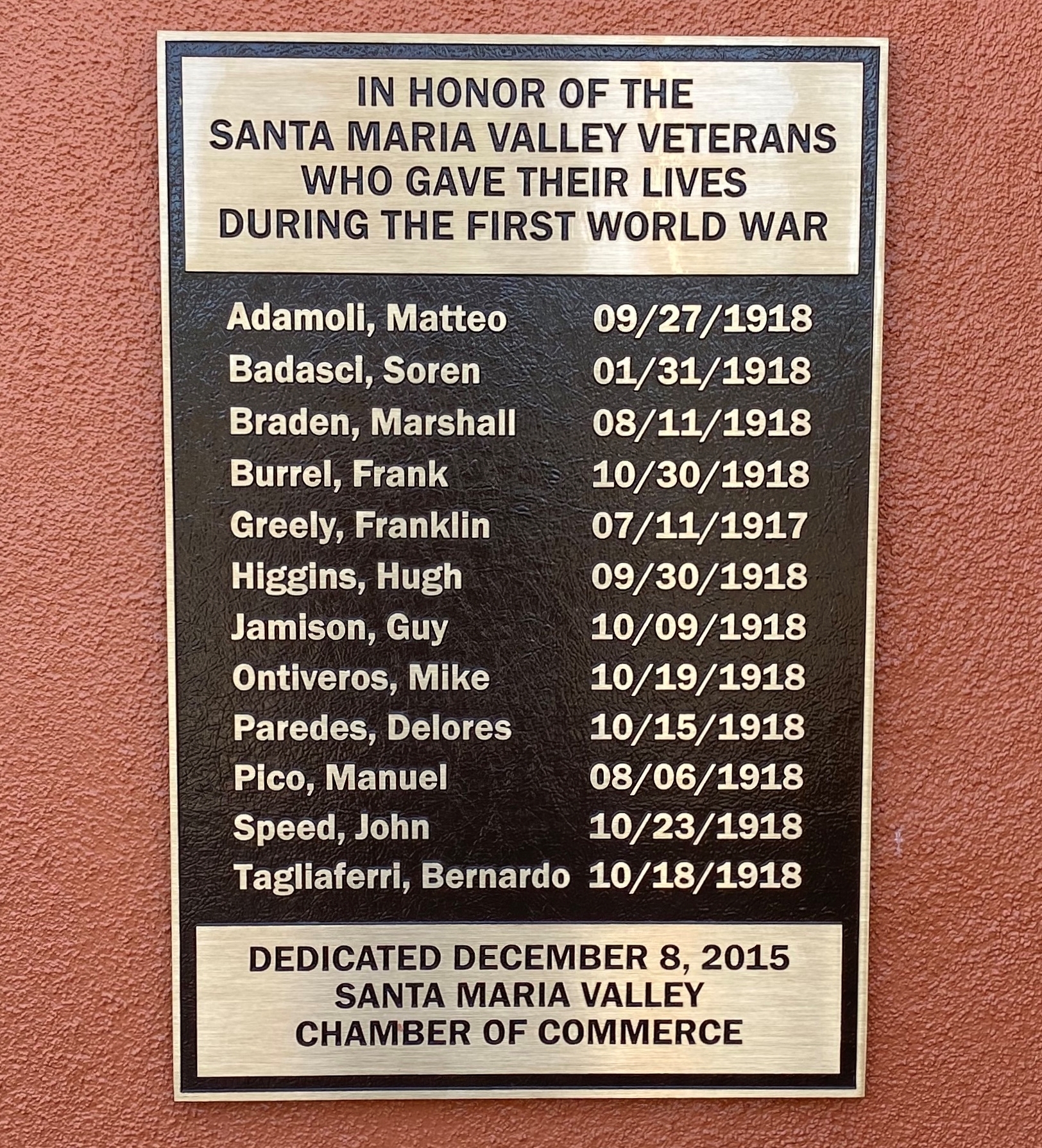 SANTA MARIA VALLEY WORLD WAR I MEMORIAL PLAQUE