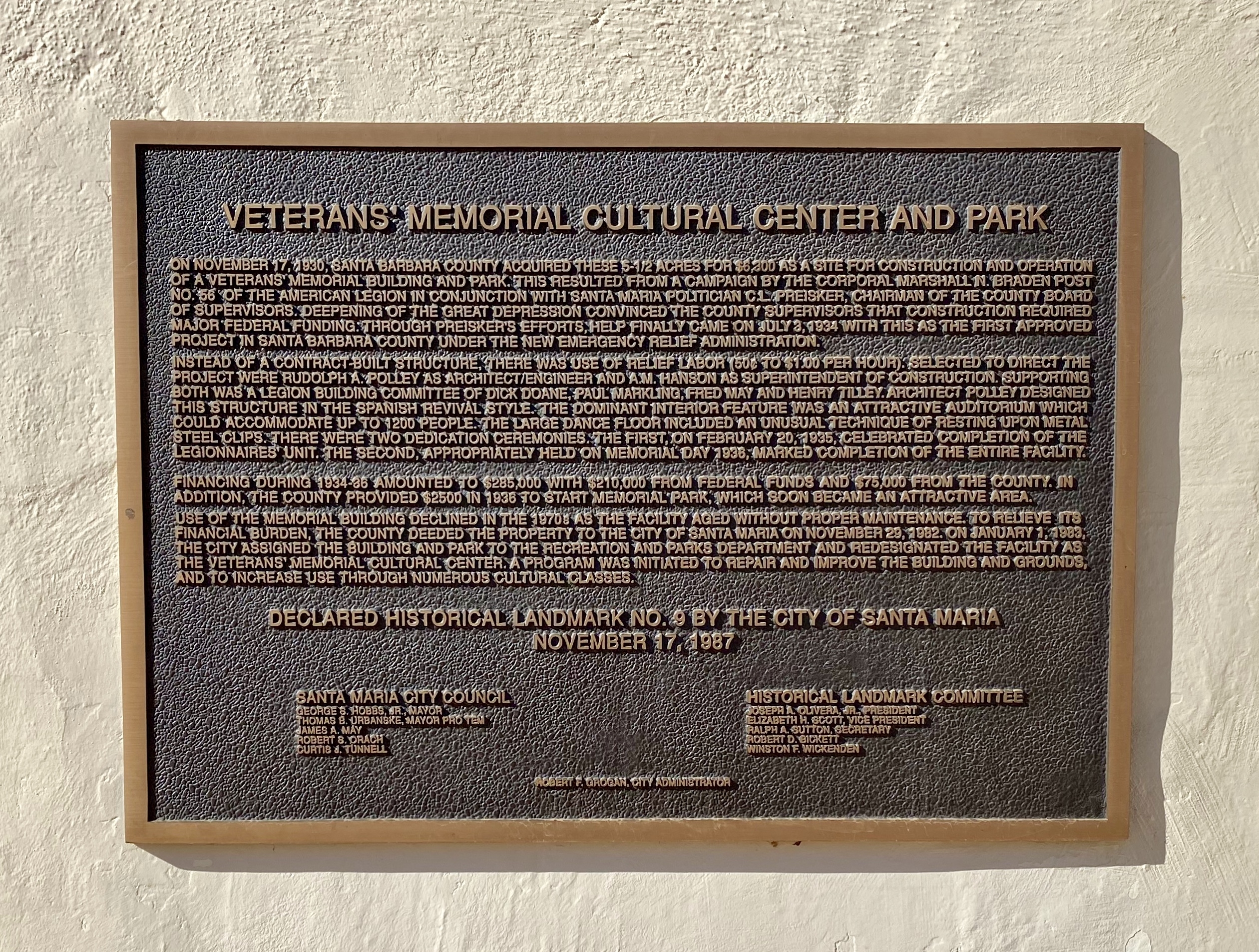 SANTA MARIA VETERANS MEMORIAL CULTURAL CENTER AND PARK PLAQUE