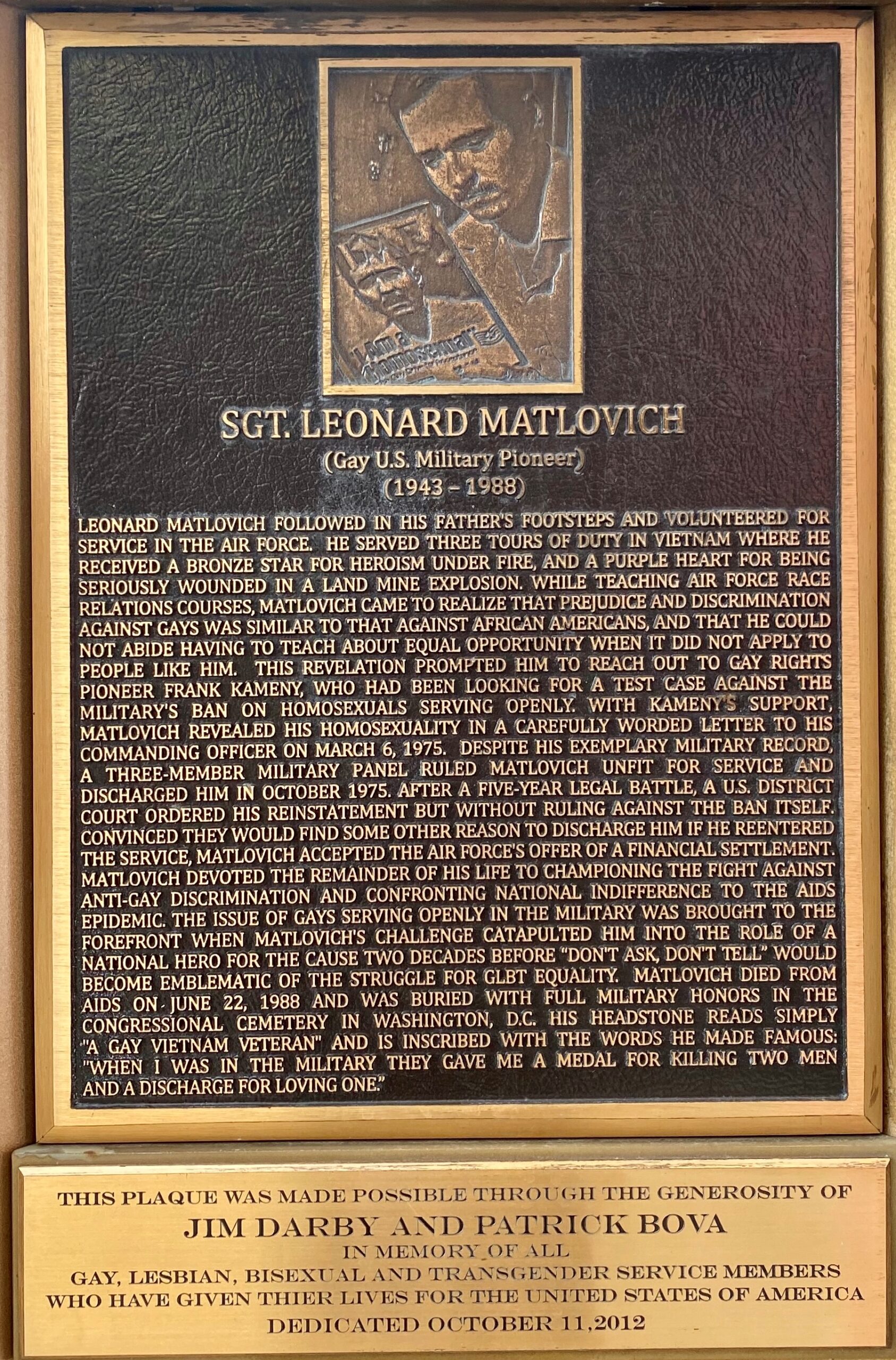 SGT. LEONARD MATLOVICH WAR MEMORIAL PLAQUE