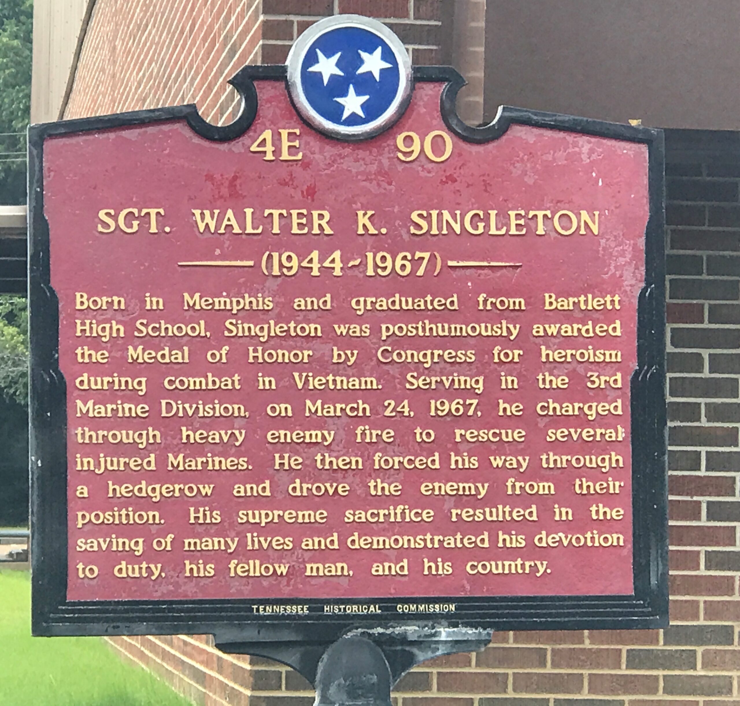 For conspicuous gallantry and intrepidity at the risk of his life above and beyond the call of duty while serving as Supply Sergeant, Company A, First Battalion, Ninth Marines, Third Marine Division on 24 March 1967. Sergeant Singleton’s company was conducting combat operations in Gio Linh District, Quang Tri Province, Republic of Vietnam, when the lead platoon received intense small arms, automatic weapons, rocket, and mortar fire from a well entrenched enemy force. As the company fought its way forward, the extremely heavy enemy fire caused numerous friendly casualties. Sensing the need for early treatment of the wounded, Sergeant Singleton quickly moved from his relatively safe position in the rear of the foremost point of the advance and made numerous trips through the enemy killing zone to move the injured men out of the danger area. Noting that a large part of the enemy fire was coming from a hedgerow, he seized a machine gun and assaulted the key enemy location, delivering devastating fire as he advanced. He forced his way through the hedgerow directly into the enemy strong point. Although he was mortally wounded, his fearless attack killed eight of the enemy and drove the remainder from the hedgerow. Sergeant Singleton’s bold actions completely disorganized the enemy defense and saved the lives of many of his comrades. His daring initiative, selfless devotion to duty and indomitable fighting spirit reflected great credit upon himself and the Marine Corps, and his performance upheld the highest traditions of the United States Naval Service.”