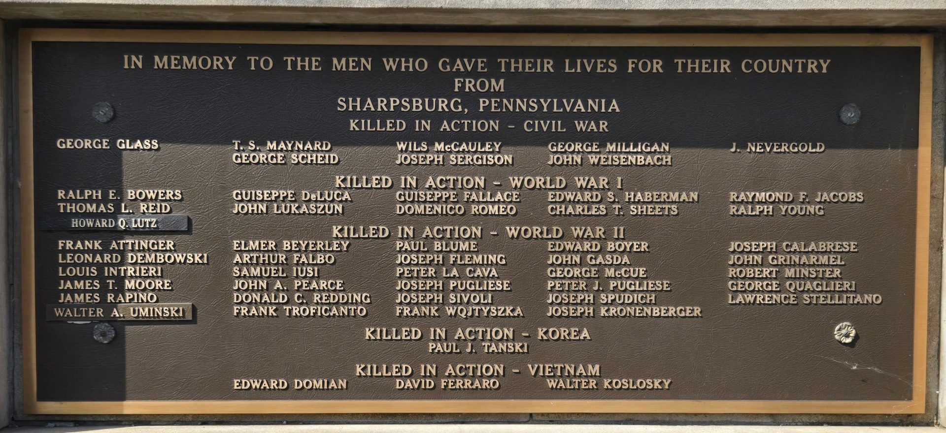 SHARPSBURG ULTIMATE SACRIFICE WAR VETERANS MEMORIAL PLAQUE A