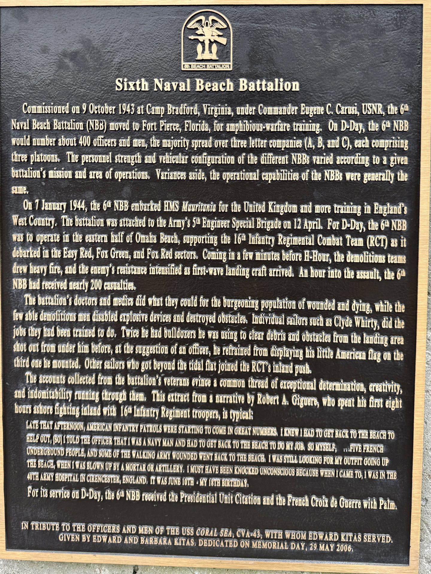 SIXTH NAVAL BEACH BATTALION WAR MEMORIAL PLAQUE