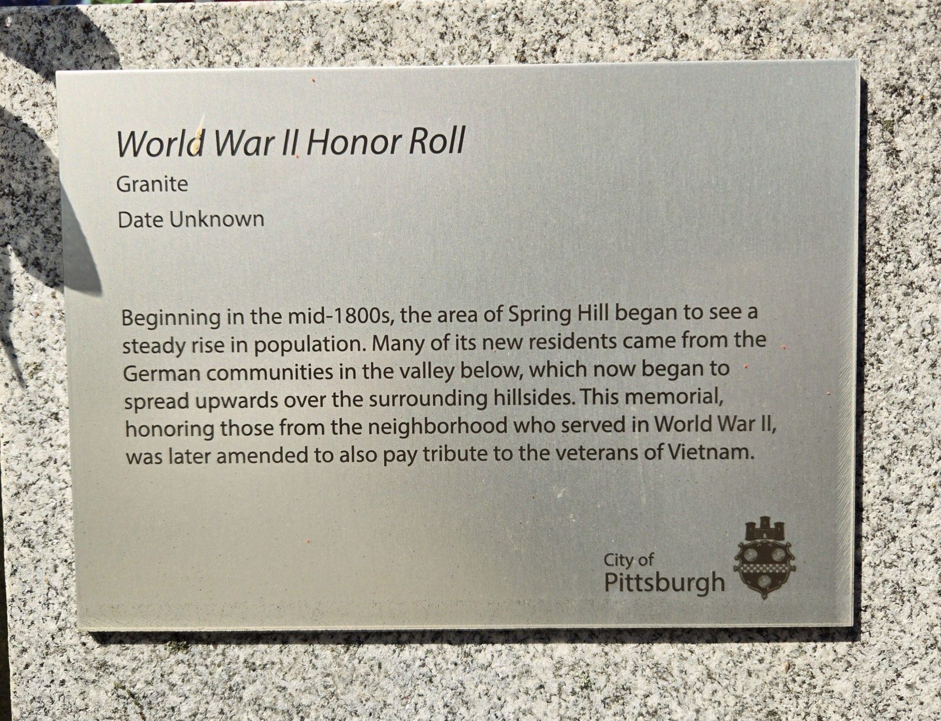 SPRING HILL WORLD WAR II HONOR ROLL MEMORIAL PLAQUE