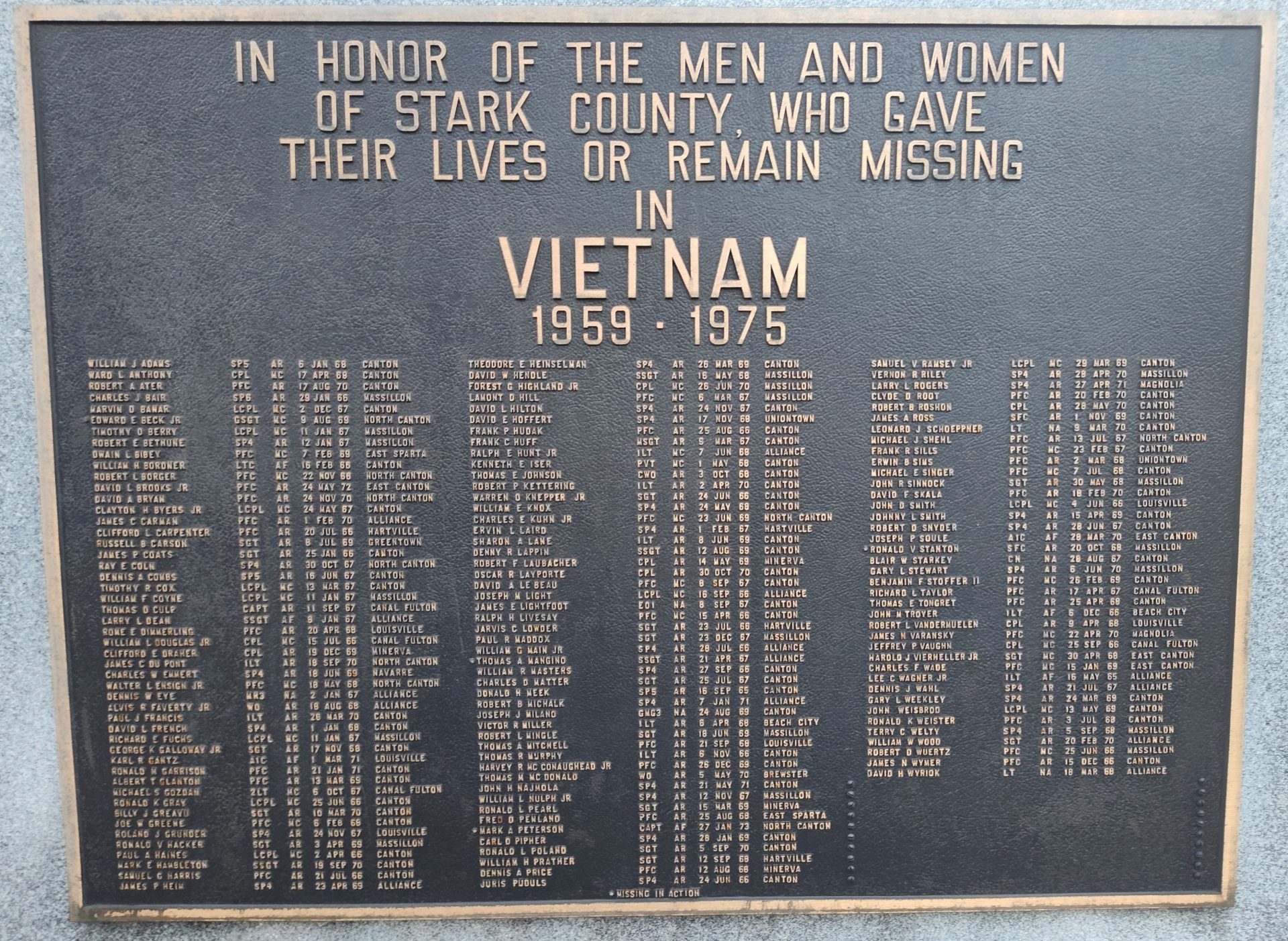 STARK COUNTY SUPREME SACRIFICE VIETNAM VETERANS MEMORIAL PLAQUE