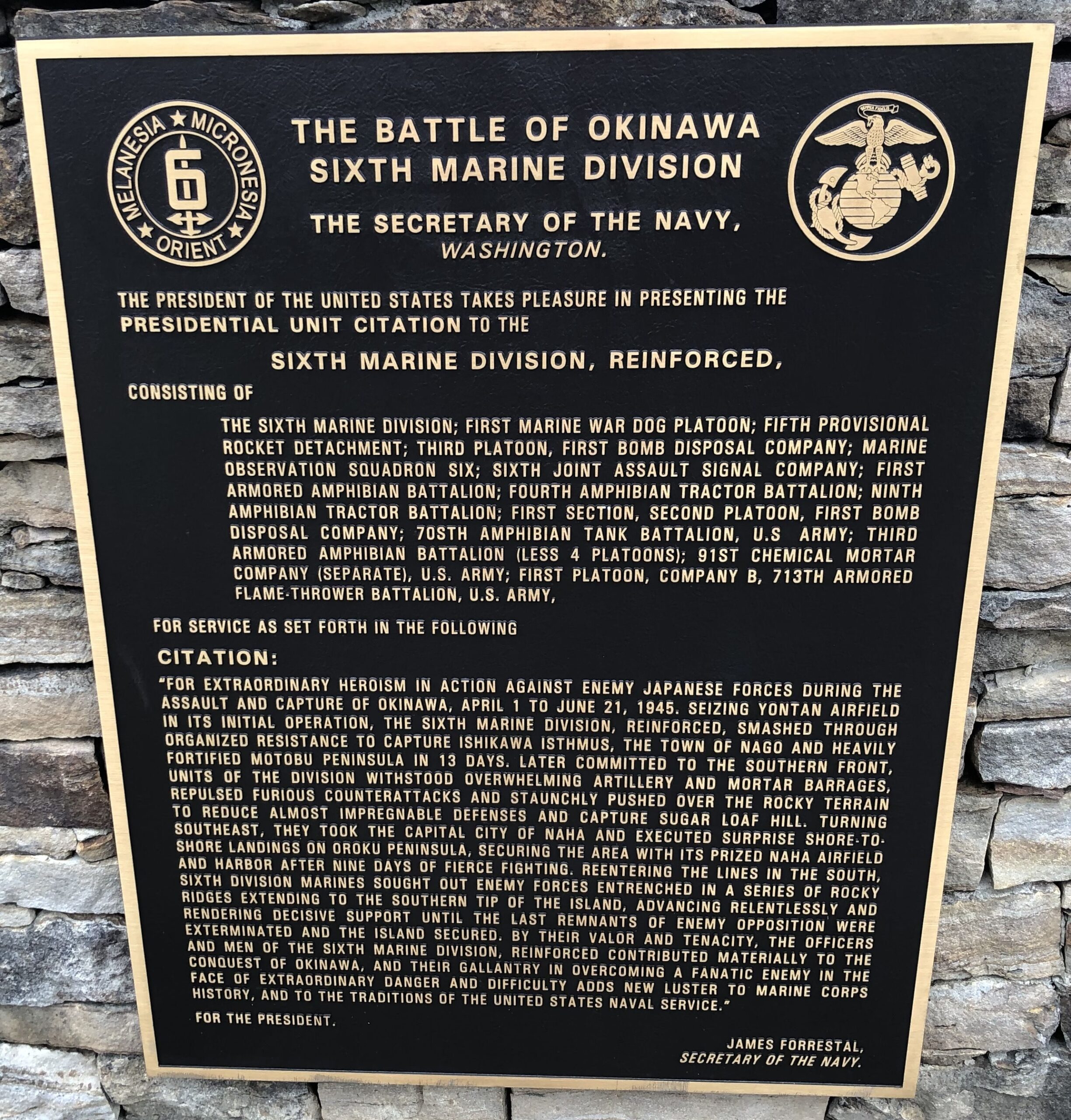 THE BATTLE OF OKINAWA SIXTH MARINE DIVISION MEMORIAL PLAQUE