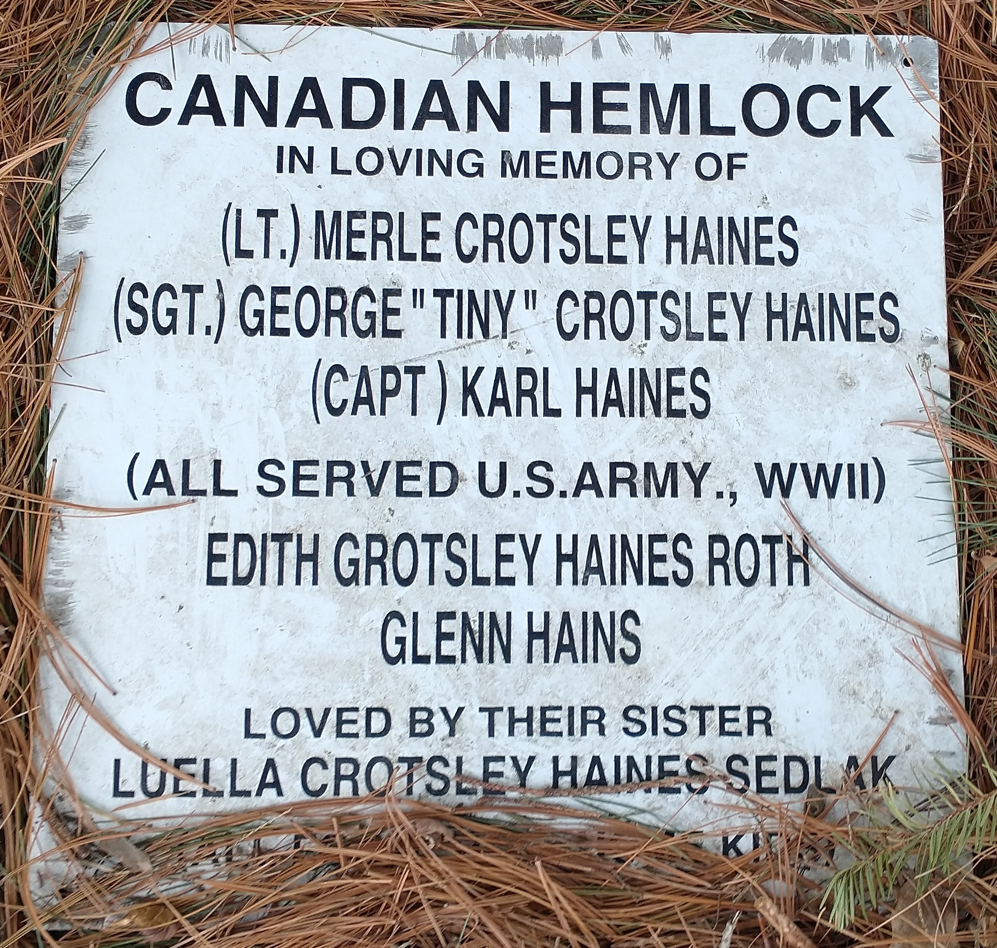 THE HAINES FAMILY CANADIAN HEMLOCK MEMORIAL TREE PLAQUE