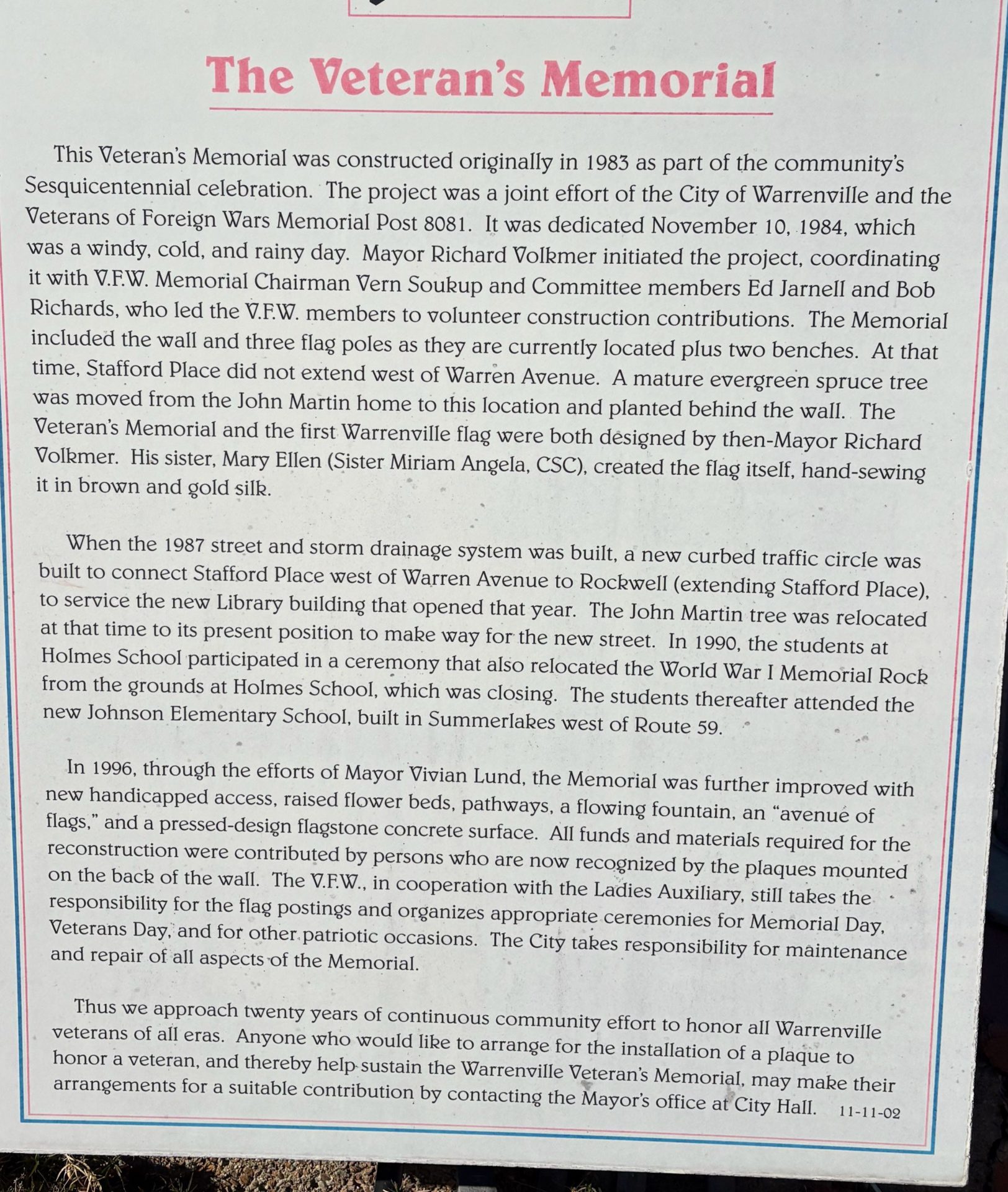 THE VETERAN’S MEMORIAL PLAQUE A