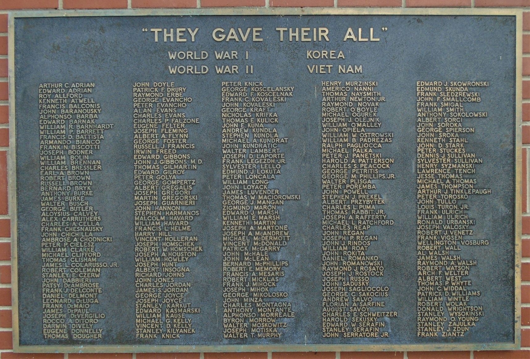 “THEY GAVE THEIR ALL” WAR MEMORIAL PLAQUE