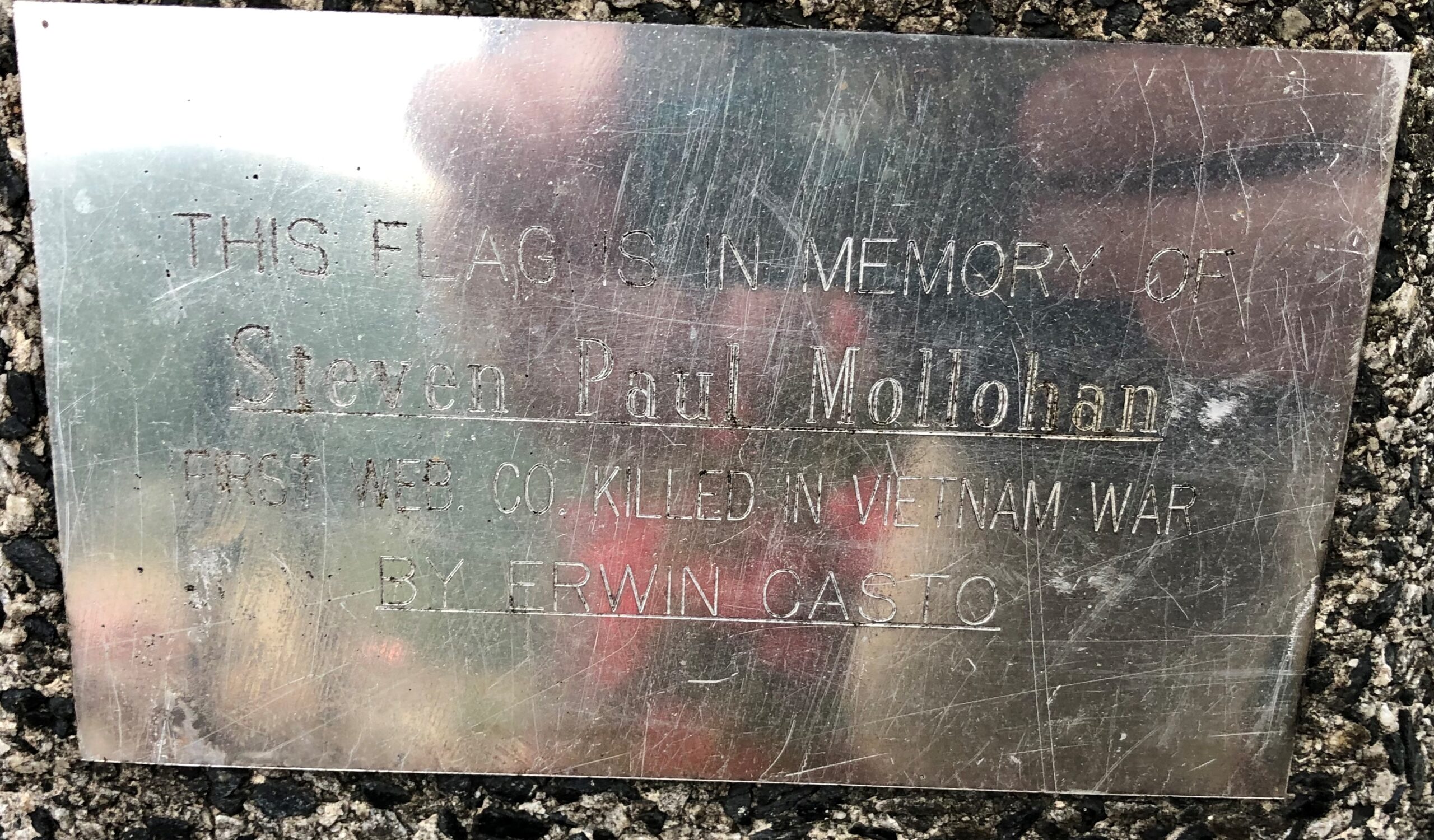 THIS FLAG IN MEMORY OF STEVEN PAUL MOLLOHAN WAR MEMORIAL LIGHT POST PLAQUE