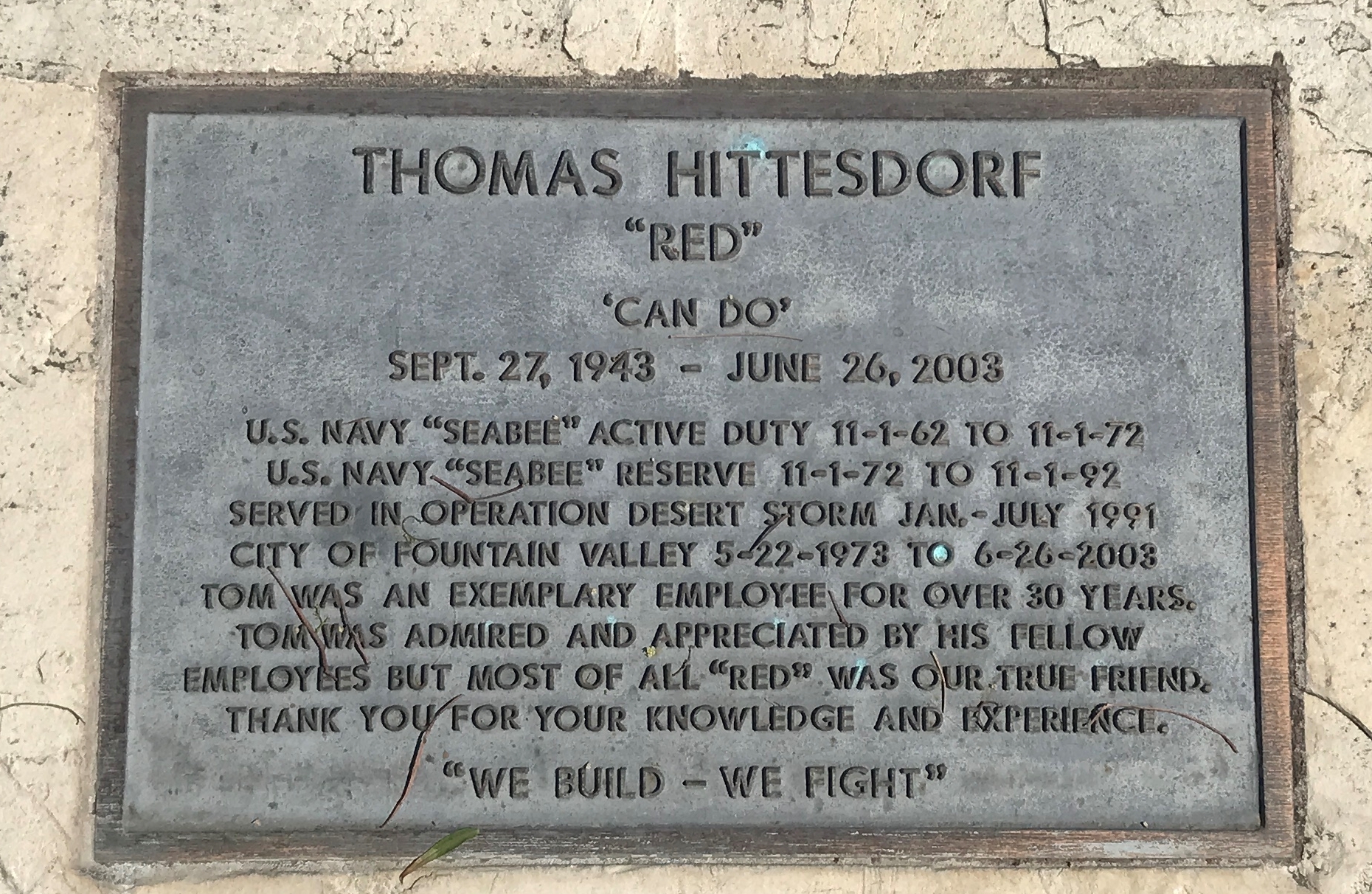 THOMAS HITTESDORF “RED” WAR MEMORIAL PLAQUE