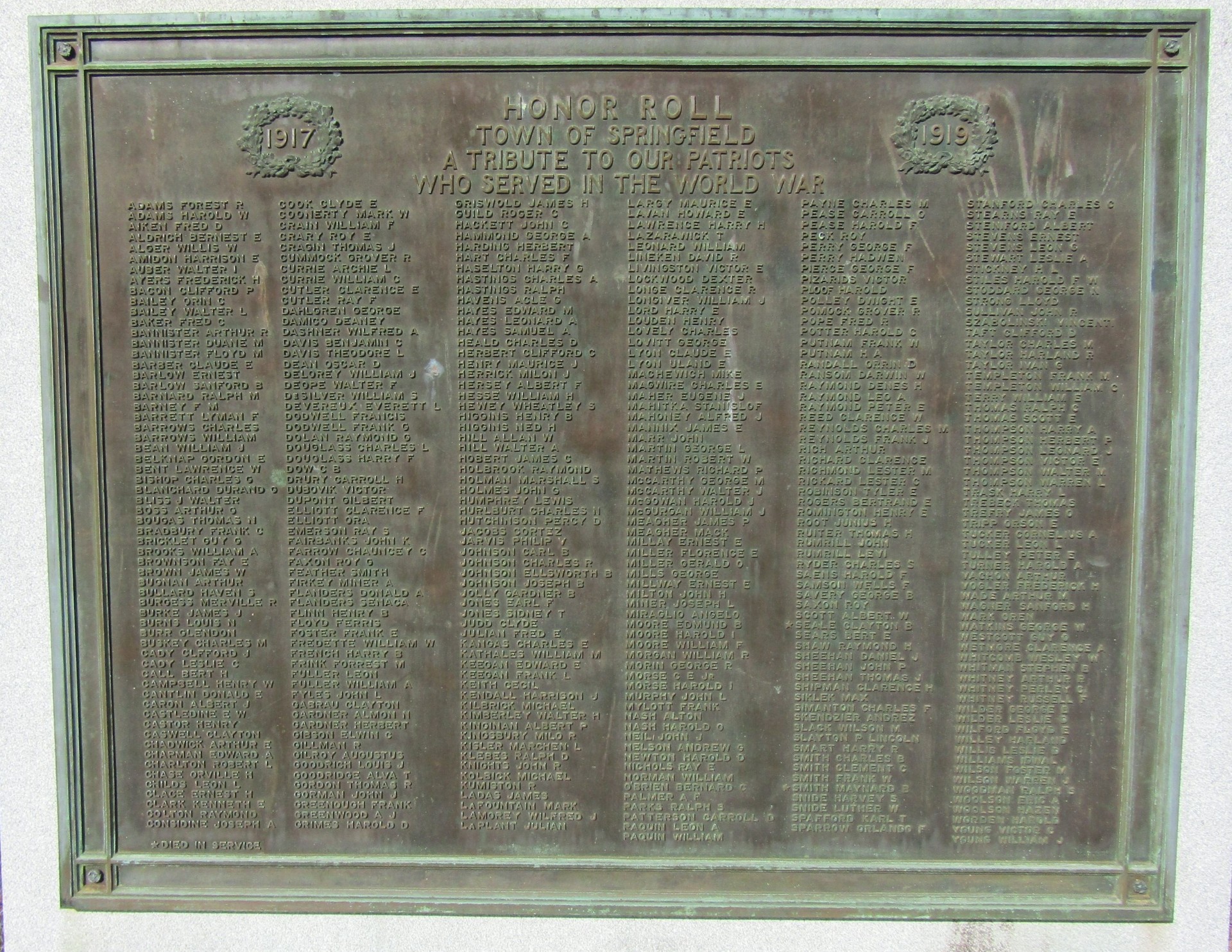 TOWN OF SPRINGFIELD WORLD WAR HONOR ROLL MEMORIAL