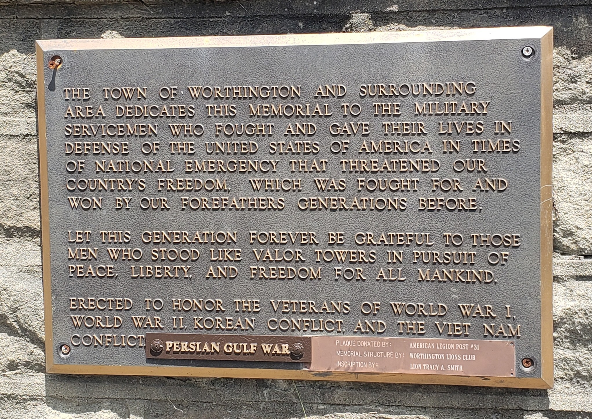 TOWN OF WORTHINGTON WAR VETERANS MEMORIAL PLAQUE