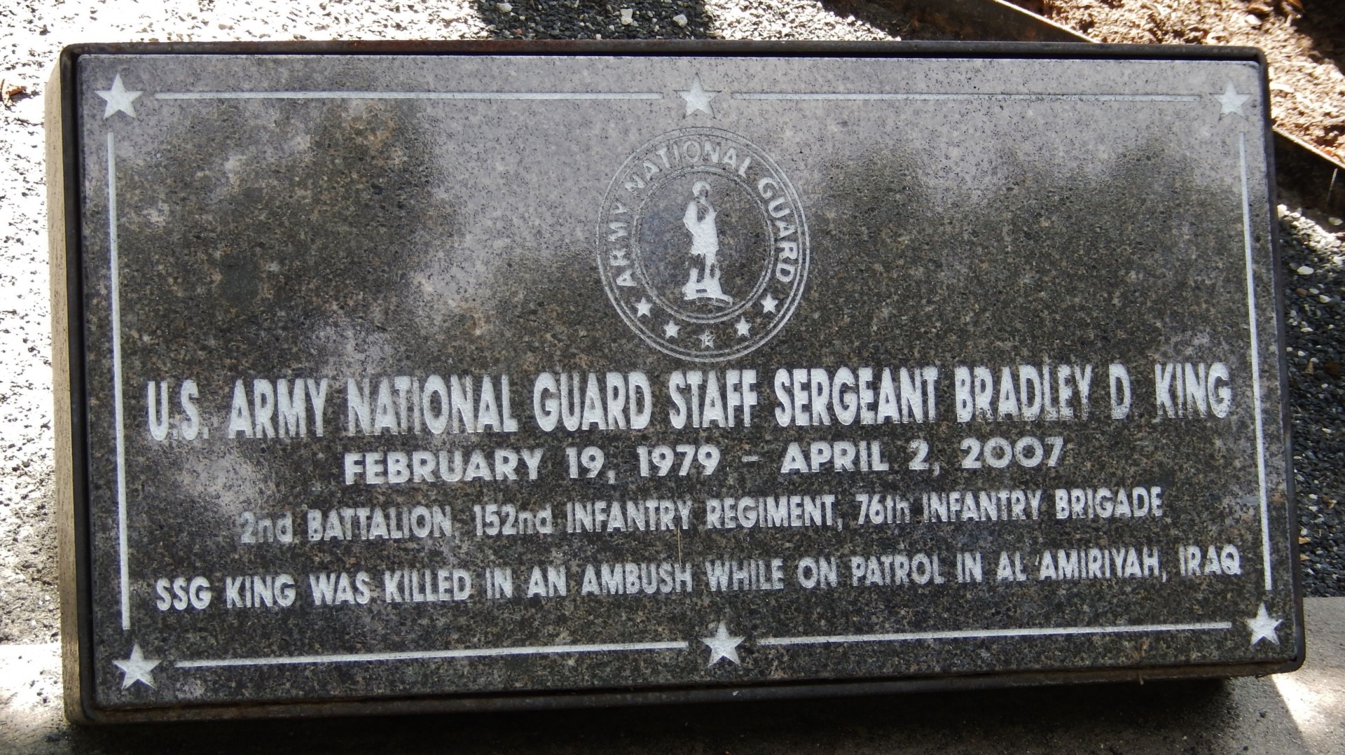 U.S. ARMY NATIONAL GUARD STAFF SERGEANT BRADLEY D. KING WAR MEMORIAL TREE STONE