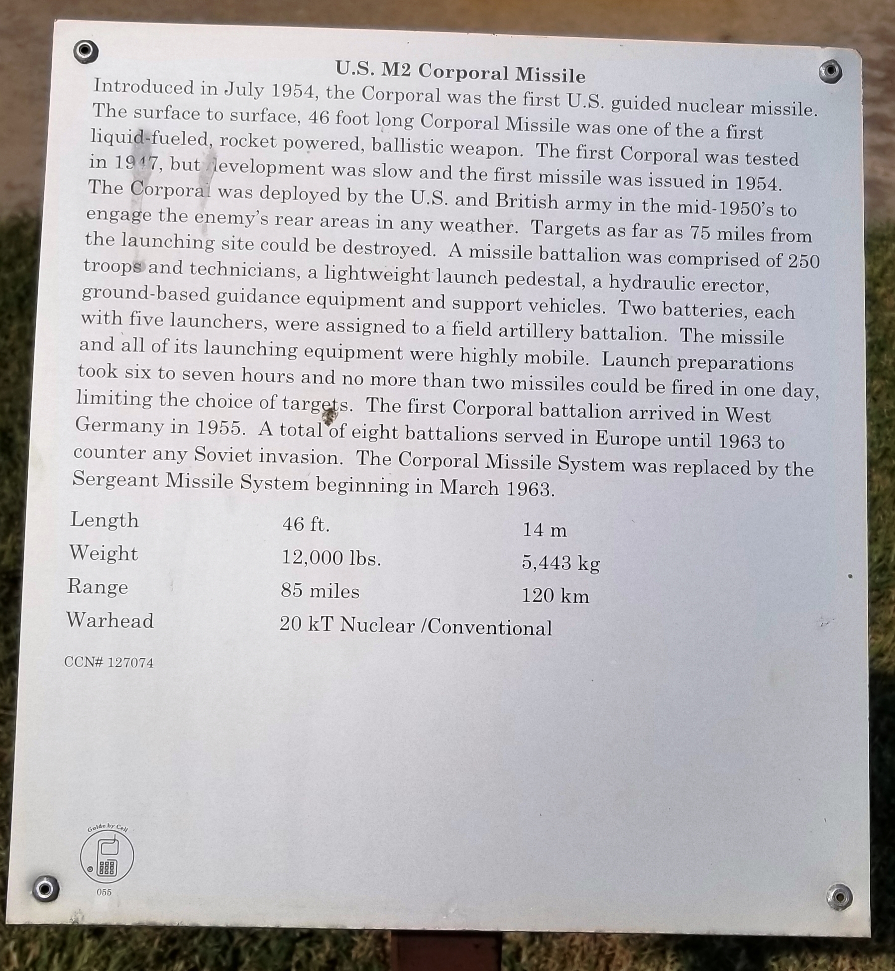 U.S. M2 CORPORAL MISSILE MEMORIAL PLAQUE