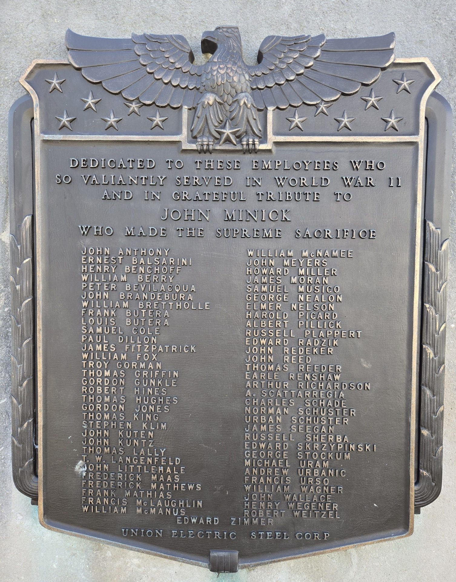 UNION ELECTRIC STEEL CORP WORLD WAR II HONOR ROLL MEMORIAL PLAQUE
