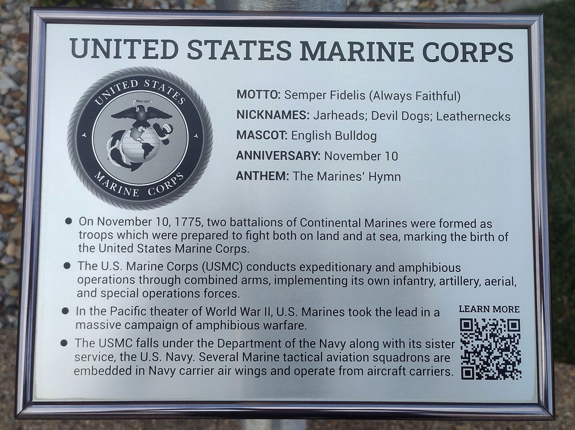 UNITED STATES MARINE CORPS MEMORIAL FLAGPOLE PLAQUE