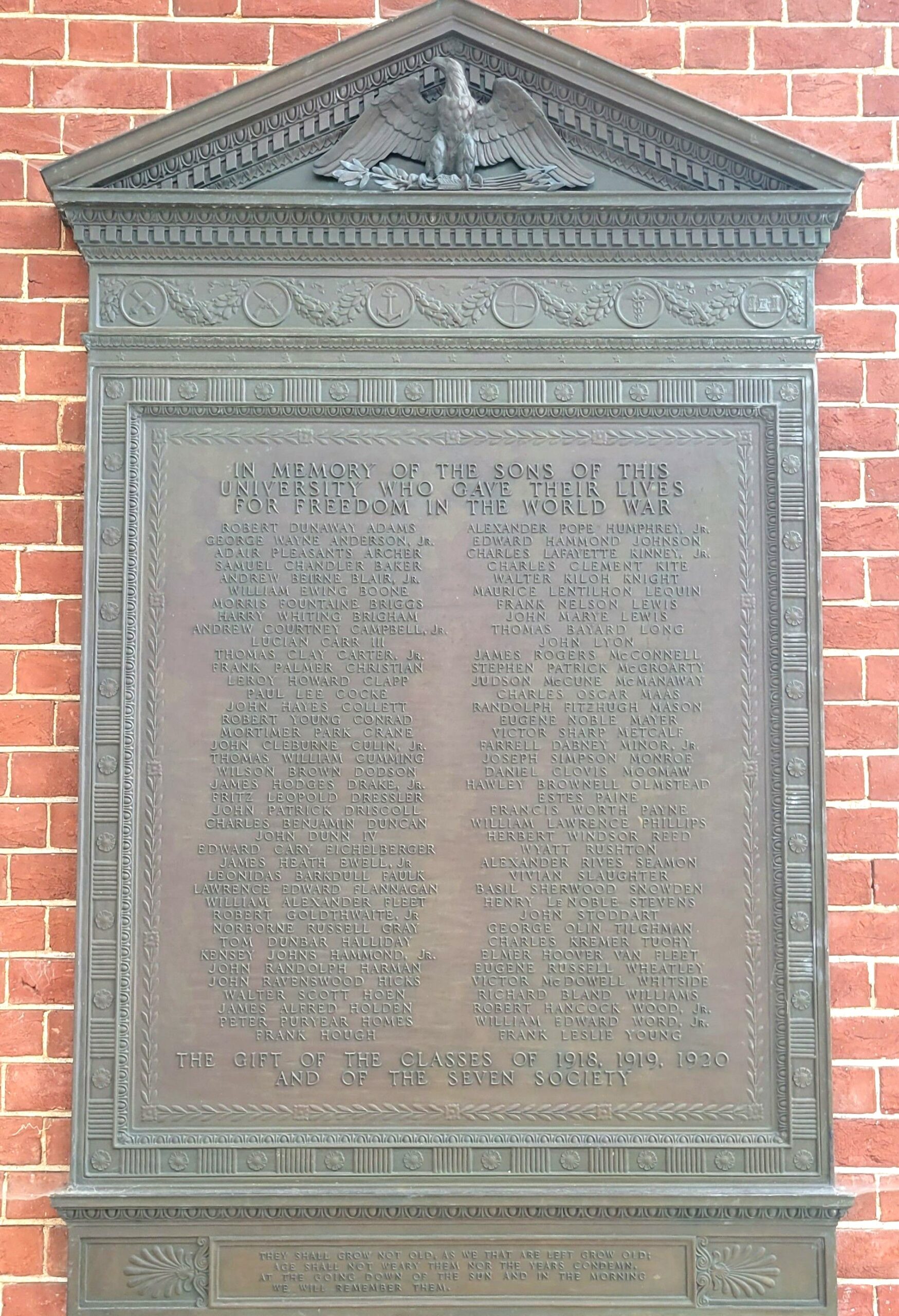 UNIVERSITY OF VIRGINIA WORLD WAR MEMORIAL PLAQUE