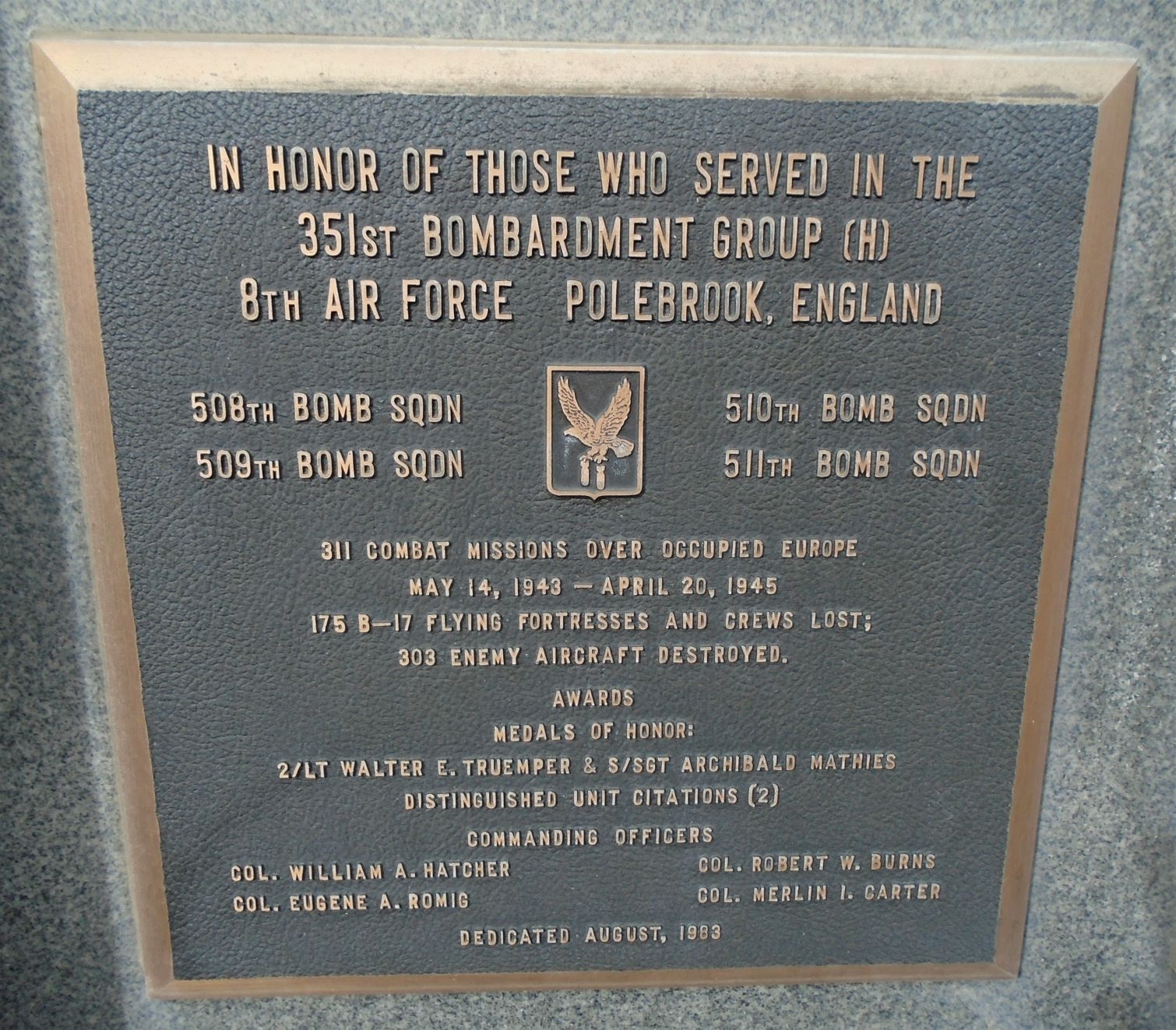 USAF ACADEMY 351ST BOMBARDMENT GROUP (H) WAR MEMORIAL PLAQUE