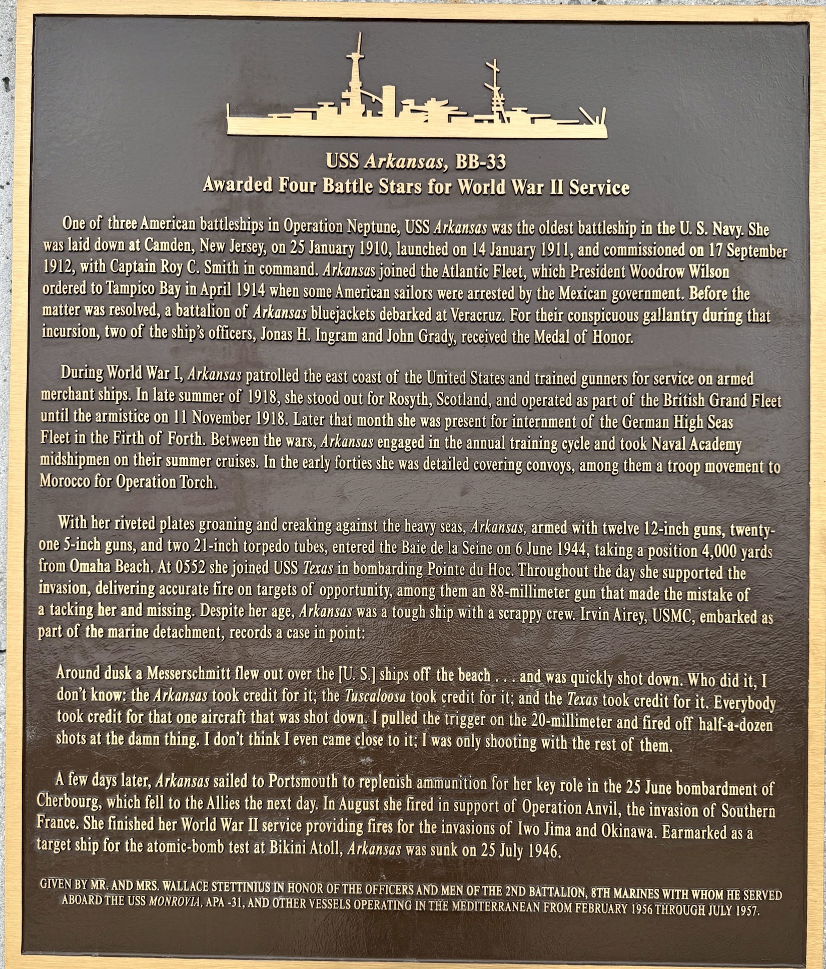 USS ARKANSAS, BB-33 WAR MEMORIAL PLAQUE