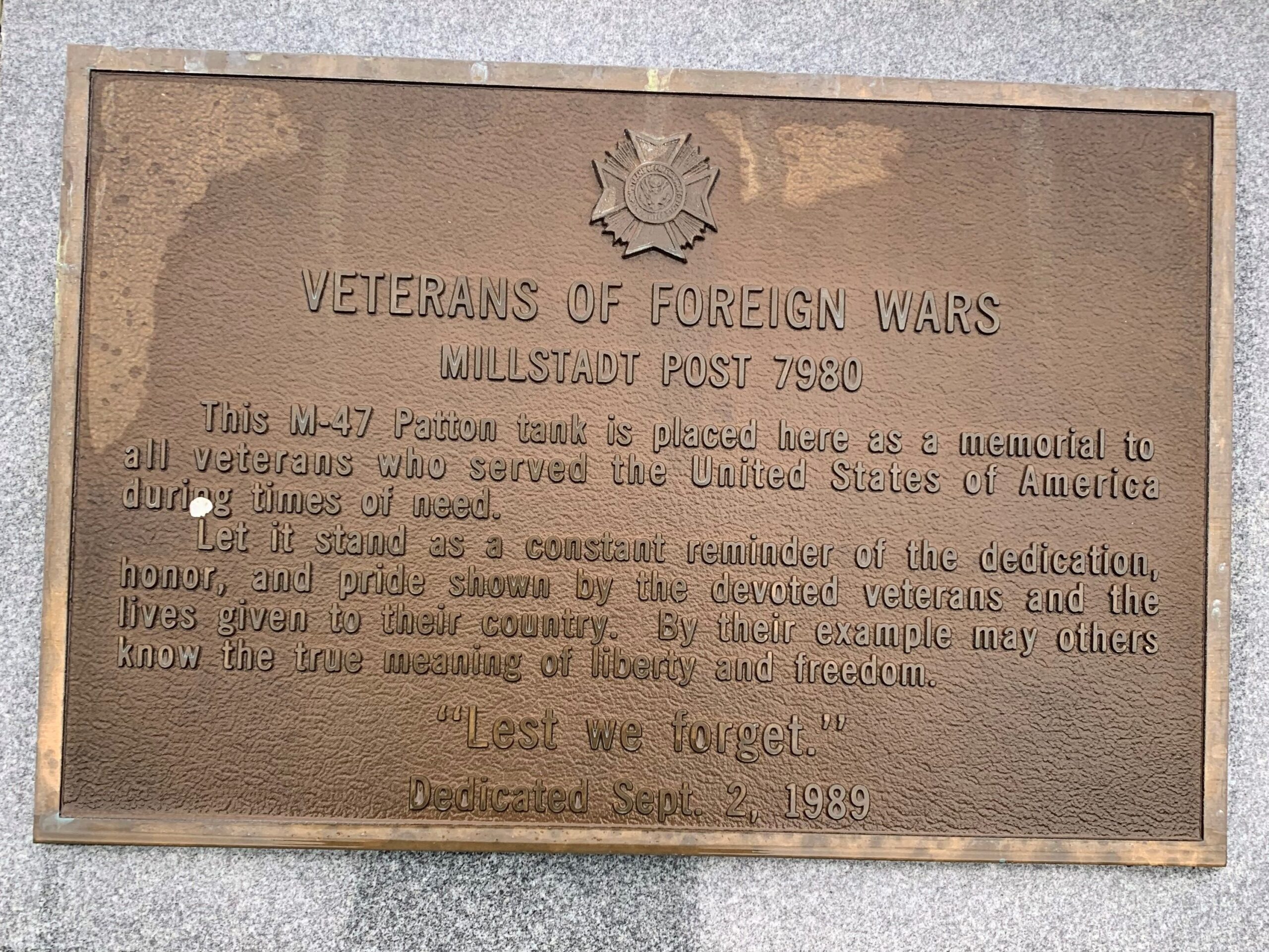 V.F.W. POST 7980 M-47 PATTON TANK MEMORIAL PLAQUE