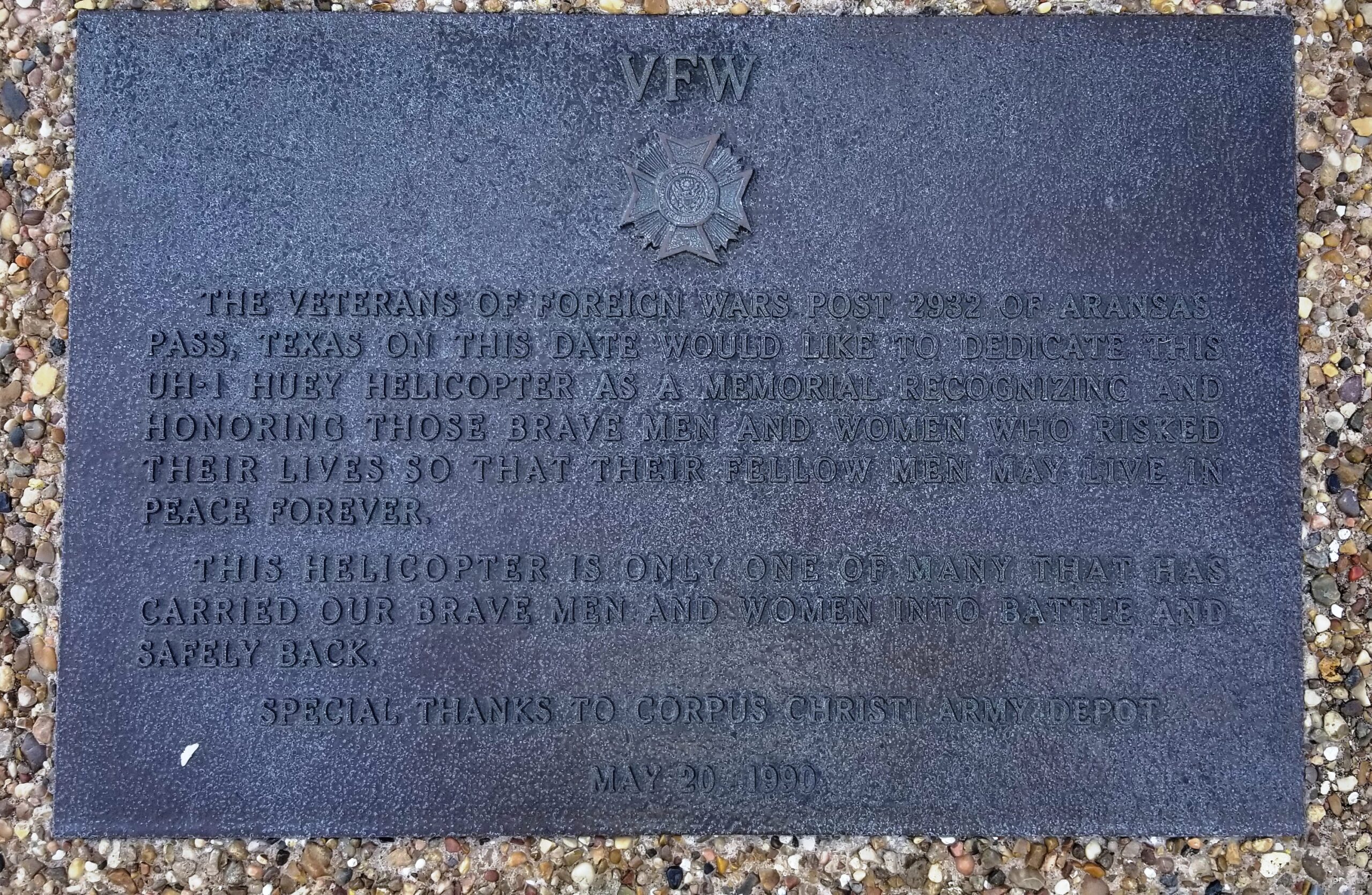VFW POST 2932 UH-1 HUEY HELICOPTER MEMORIAL PLAQUE