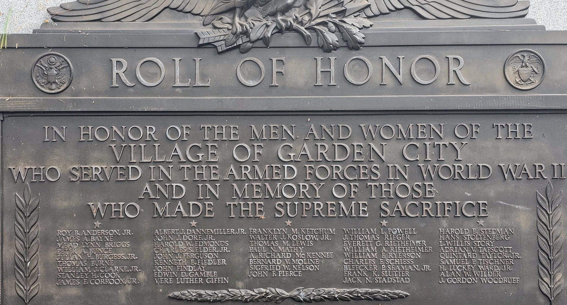 VILLAGE OF GARDEN CITY WORLD WAR II ROLL OF HONOR MEMORIAL CLOSE-UP