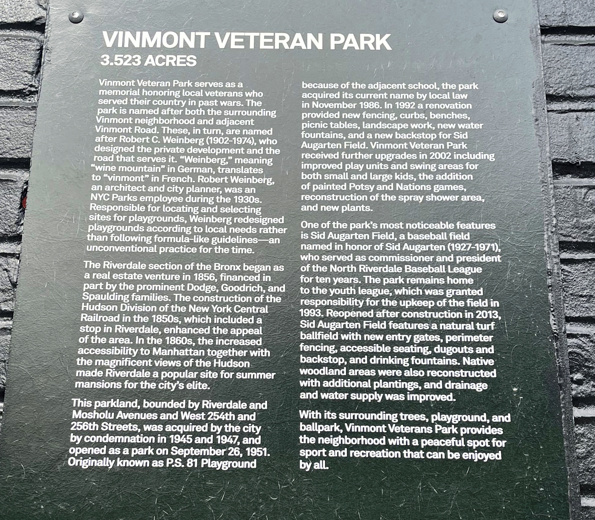 VINMONT VETERAN PARK MEMORIAL PLAQUE