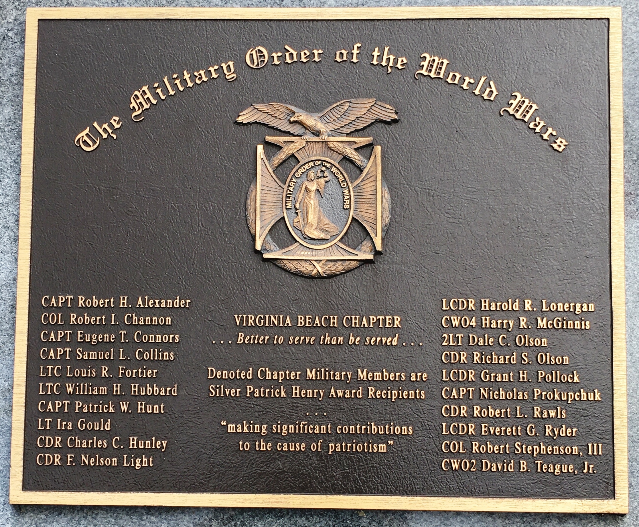 VIRGINIA BEACH CHAPTER OF THE MILITARY ORDER OF THE WORLD WARS MEMORIAL PLAQUE