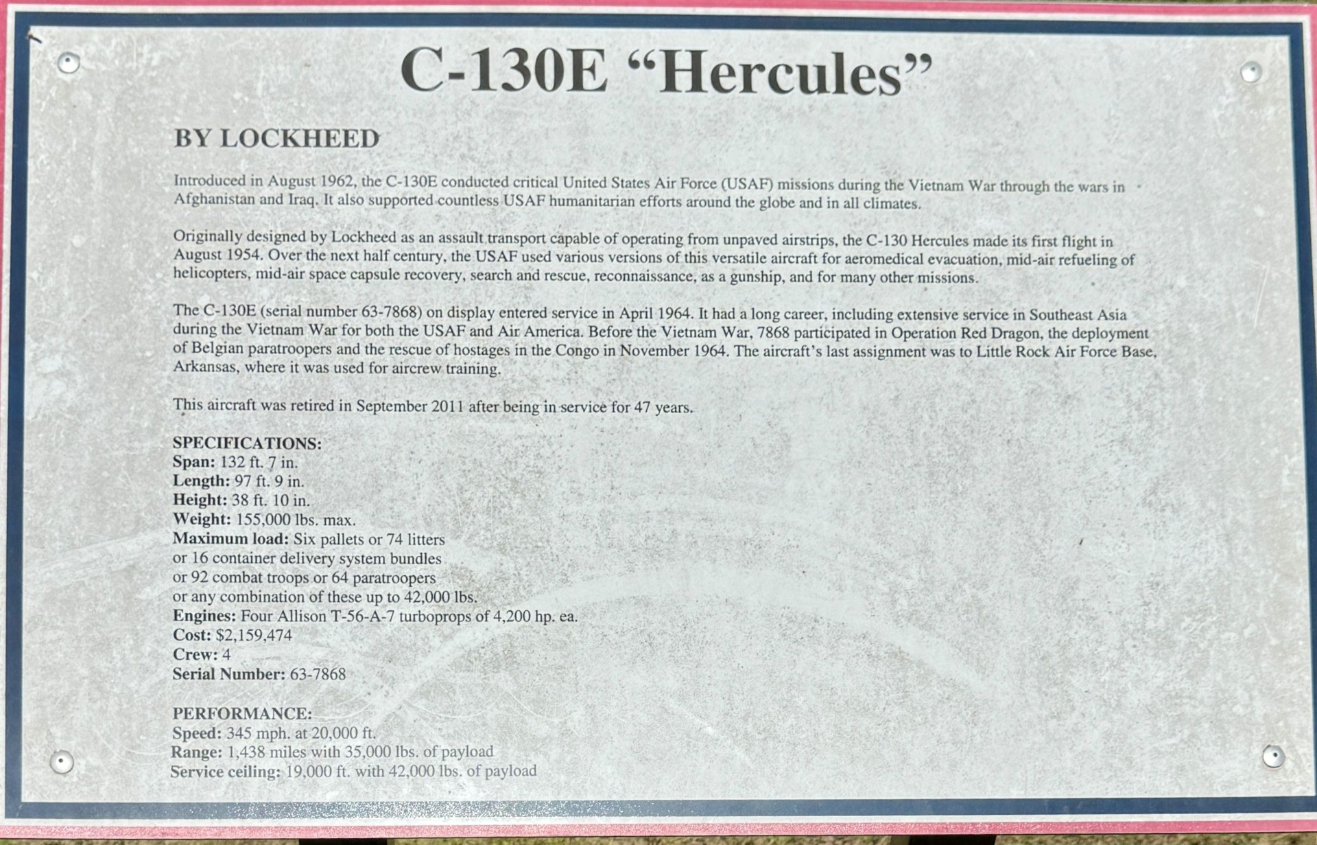 WARNER ROBINS C-130E “HERCLULES” MEMORIAL AIRCRAFT PLAQUE