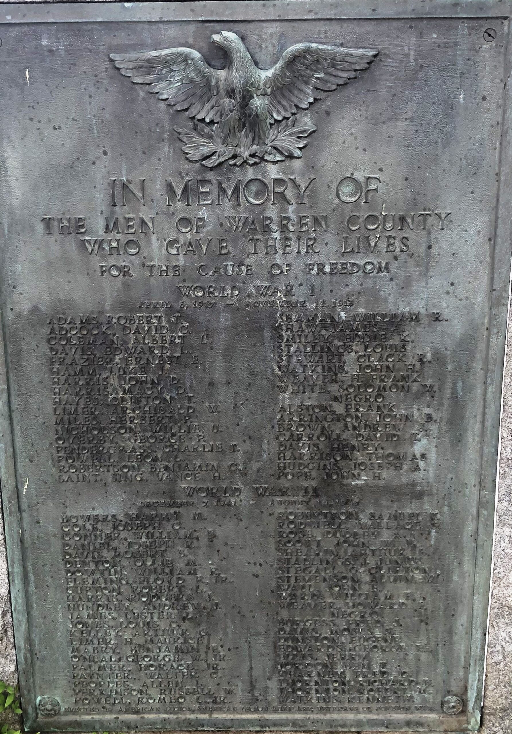 WARREN COUNTY WORLD WARS I AND II MEMORIAL PLAQUE