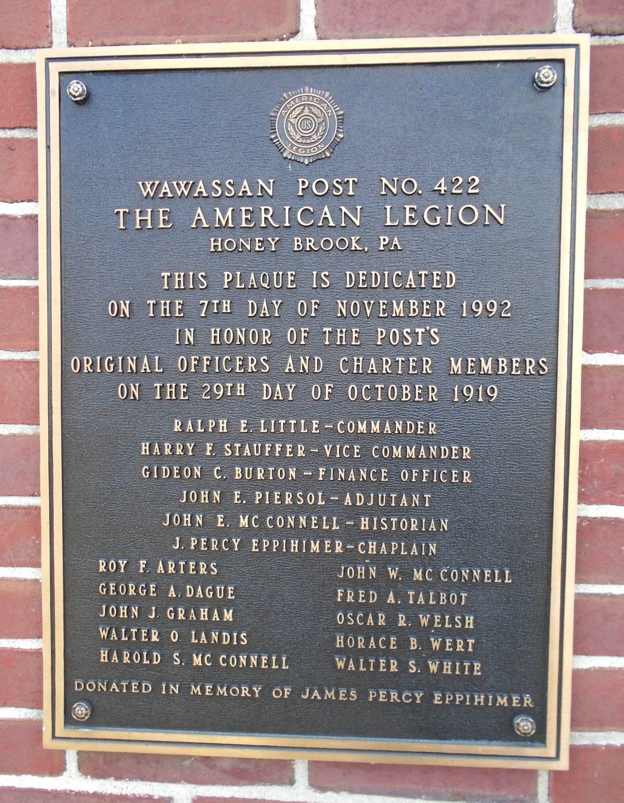 WAWASSAN AMERICAN LEGION POST NO. 422 ORIGINAL OFFICERS AND CHARTER MEMBERS MEMORIAL PLAQUE